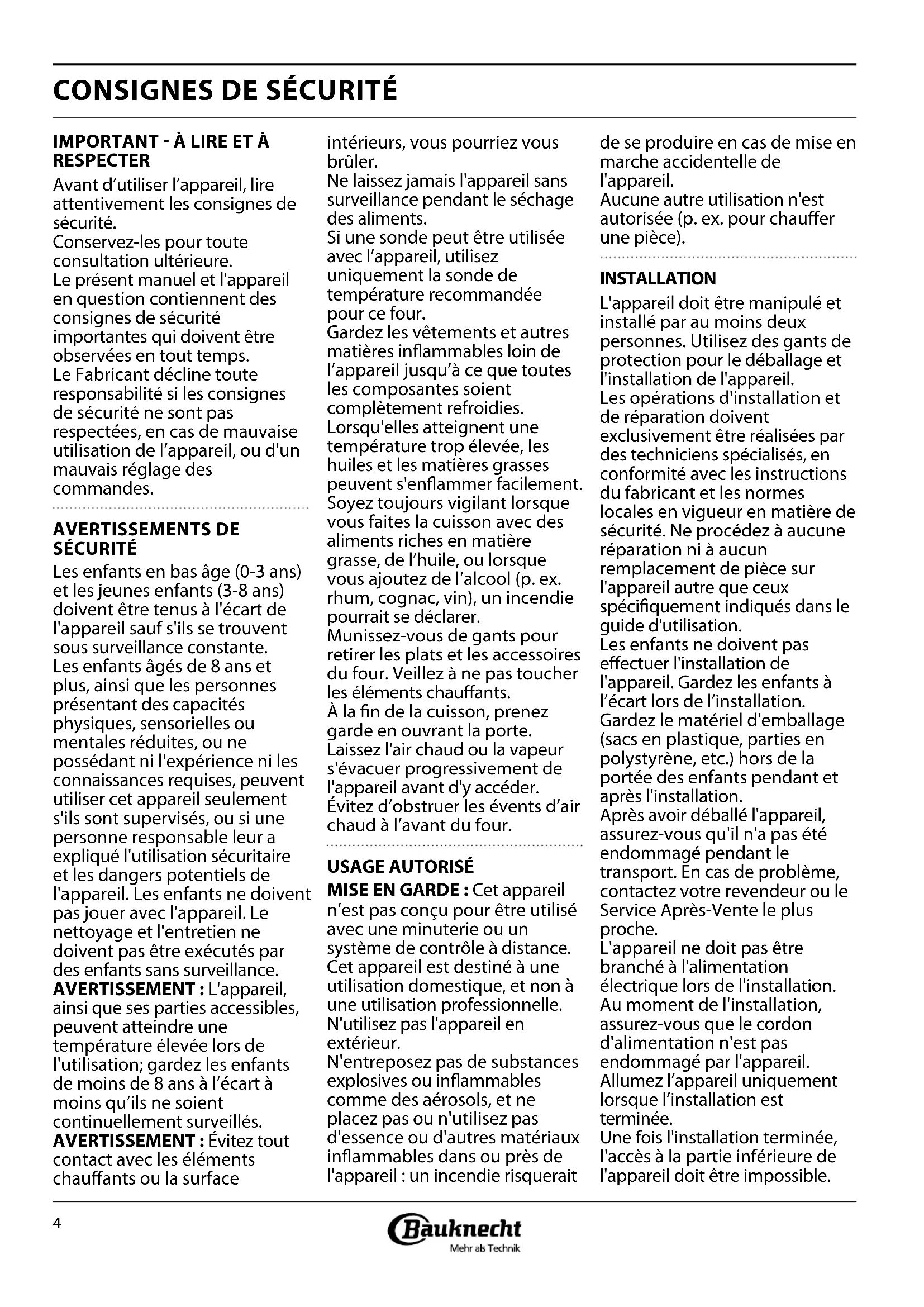 FRANÇAIS CONSIGNES D'INSTALLATION, D'UTILISATION et DE SÉCURITÉ MERCI D'AVOIR ACHETÉ UN PRODUIT BAUKNECHT. Afin de recevoir une assistance plus complète, merci d'enregistrer votre appareil sur www.bauknecht.eu/register Index Consignes de sécurité