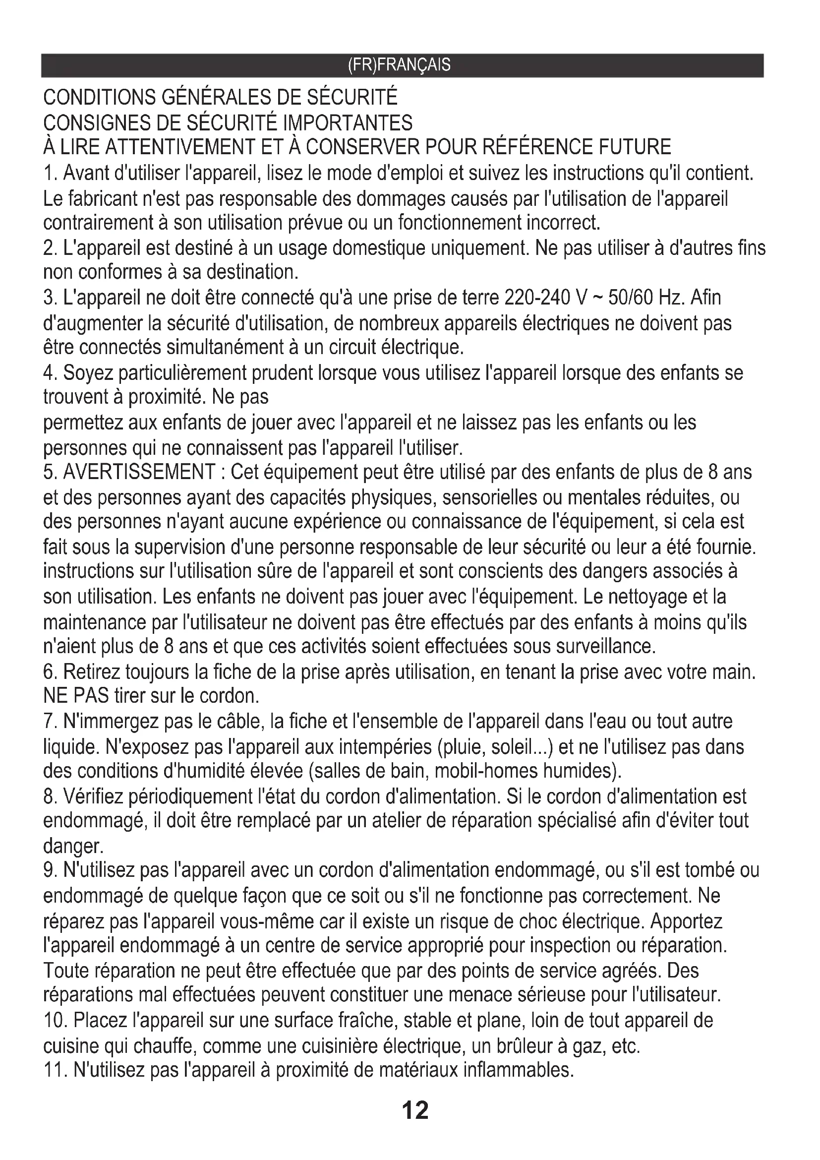 7. N'immergez pas le câble, la fiche et l'ensemble de l'appareil dans l'eau ou tout autre