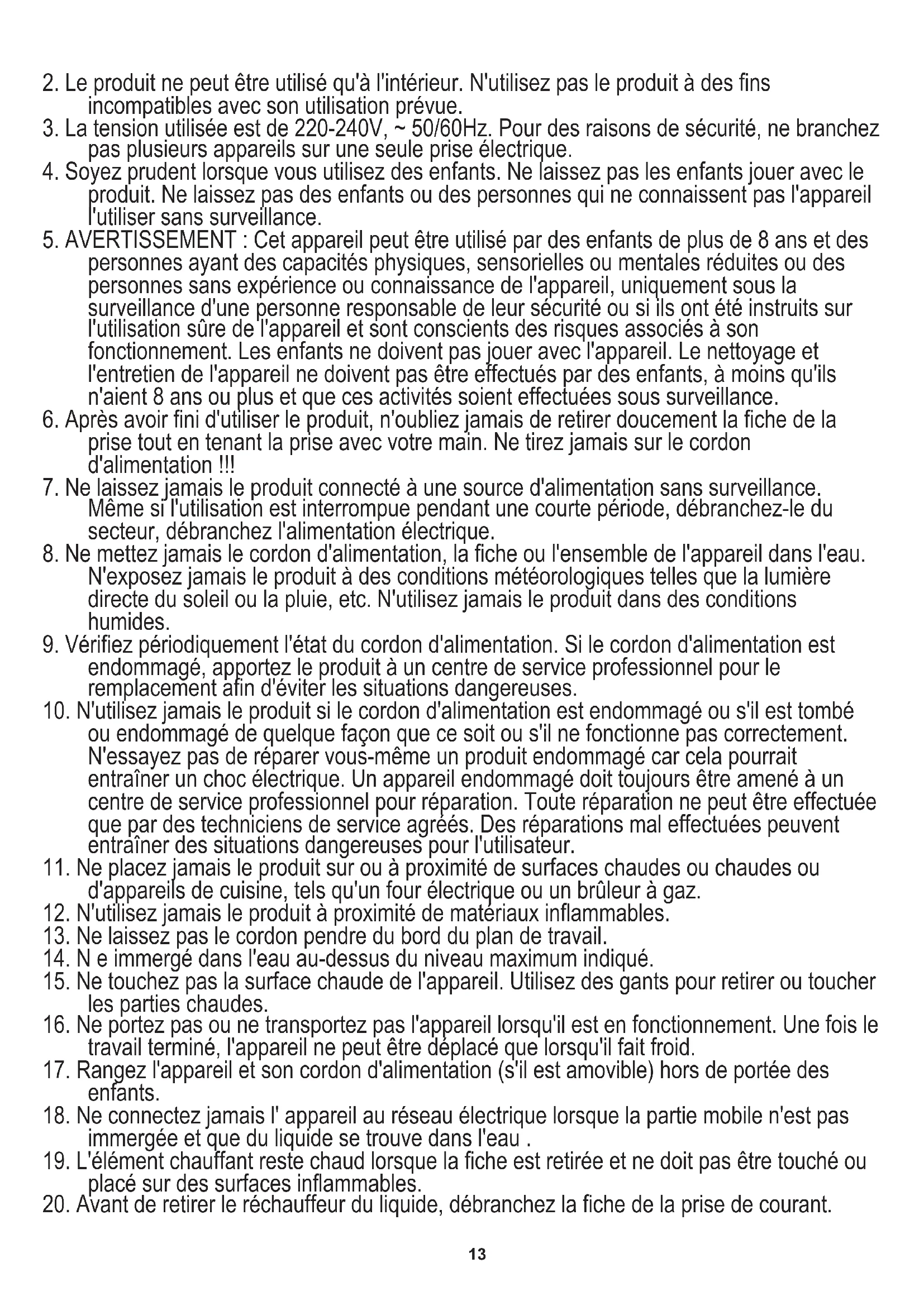 8. Ne mettez jamais le cordon d'alimentation, la fiche ou l'ensemble de l'appareil dans l'eau.