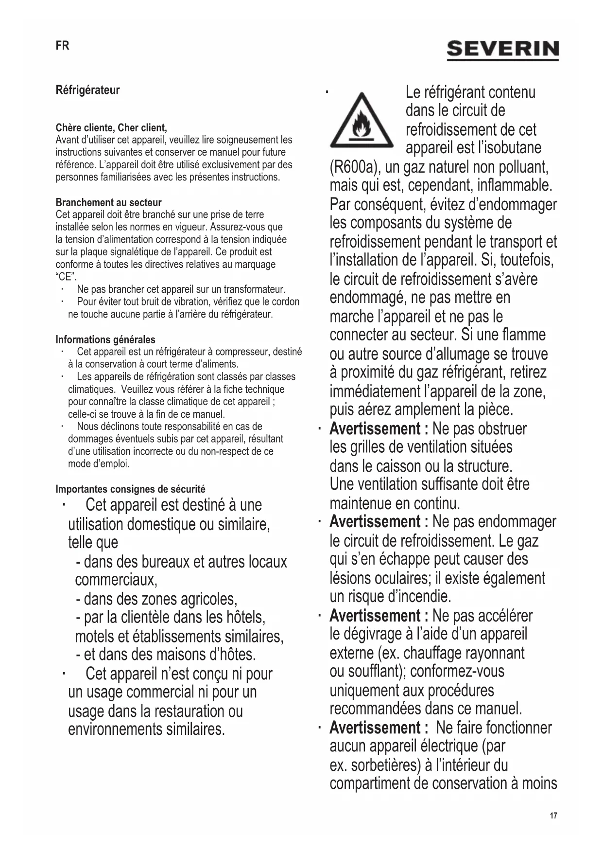 Le réfrigérant contenu dans le circuit de refroidissement de cet appareil est l’isobutane (R600a), un gaz naturel non polluant, mais qui est, cependant, inammable. Par conséquent, évitez d’endommager les composants du système de refroidissement pendant le transport et l’installation de l’appareil. Si, toutefois, le circuit de refroidissement s’avère endommagé, ne pas mettre en marche l’appareil et ne pas le connecter au secteur. Si une amme ou autre source d’allumage se trouve à proximité du gaz réfrigérant, retirez immédiatement l’appareil de la zone, puis aérez amplement la pièce. ∙ Avertissement : Ne pas obstruer les grilles de ventilation situées dans le caisson ou la structure. Une ventilation sufsante doit être maintenue en continu. ∙ Avertissement : Ne pas endommager le circuit de refroidissement. Le gaz qui s’en échappe peut causer des lésions oculaires; il existe également un risque d’incendie. ∙ Avertissement : Ne pas accélérer le dégivrage à l’aide d’un appareil externe (ex. chauffage rayonnant ou soufant); conformez-vous uniquement aux procédures recommandées dans ce manuel. ∙ Avertissement : Ne faire fonctionner aucun appareil électrique (par ex. sorbetières) à l’intérieur du compartiment de conservation à moins FR18 142 x 208 mm que celui-ci ne soit spéciquement permis dans ces instructions. ∙ Avant de le brancher sur le secteur, vériez minutieusement l’appareil, y compris le cordon d’alimentation, pour tout signe de dommages survenus pendant le transport. Au cas où un dommage aurait été détecté, ne pas brancher l’appareil sur le secteur. ∙ Lors de la mise en place de l’appareil veuillez vous assurer que le câble de raccordement n’est pas coincé et qu’il ne risque pas d’être endommagé. ∙ Veuillez ne pas placer de prises multiples mobiles ou blocs d’alimentation à l’arrière de l’appareil. ∙ Cet appareil n’est pas conçu pour la conservation des liquides explosifs tels que les aérosols à gaz propulseur. ∙ En cas de vente ou cession de l’appareil à un tiers, ou sa remise à un centre de recyclage agréé, il est important de signaler la présence de la matière isolante ‘cyclopentane’ et également du réfrigérant R600a. Pour des informations supplémentaires concernant un recyclage approprié, veuillez vous référer au paragraphe Mise au rebut. ∙ An de se conformer aux normes de sécurité en vigueur et d’éviter tout risque, la réparation ou la modication de cet appareil, y compris le remplacement du cordon d’alimentation, doit être effectuée par un de nos agents agréés. ∙ Cet appareil peut être utilisé par des enfants (à partir de 8 ans) et par des personnes souffrant de déciences physiques, sensorielles ou mentales, ou manquant d’expérience ou de connaissances, s’ils ont été formés à l’utilisation de l’appareil et ont été supervisés, et s’ils en comprennent les dangers et les précautions de sécurité à prendre. ∙ Les enfants entre 3 et 8 ans sont autorisés à charger et décharger le réfrigérateur/congélateur. ∙ Les enfants ne sont pas autorisés à jouer avec l’appareil. ∙ Les enfants ne doivent pas procéder à des travaux de maintenance ou de nettoyage sur l’appareil à moins d’être surveillés. ∙ Pour un nettoyage fréquent, nous vous conseillons d’utiliser de l’eau tiède additionnée d’un détergent doux. Pour des informations détaillées concernant le nettoyage de l’appareil, veuillez vous référer au paragraphe Dégivrage et nettoyage. An d’éviter la contamination des aliments veuillez respecter les consignes suivantes : ∙ Lorsqu’une porte est ouverte longtemps, une augmentation signicative de la température dans les compartiments de l’appareil peut survenir. ∙ Toute surface étant en contact avec des aliments et les systèmes de drainage accessibles doivent être nettoyées régulièrement. ∙ Veuillez ne conserver de la viande crue et du poisson que dans19 142 x 208 mm des récipients adéquats dans le réfrigérateur pour éviter tout contact avec d’autres aliments. ∙ Si le réfrigérateur/congélateur reste vide pendant une période prolongée, veuillez éteindre l’appareil, le nettoyer et laisser la porte ouverte an d’éviter la formation de moisissures. Conservation des Aliments ∙ Les températures à l’intérieur de la cuve et du compartiment congélation dépendent principalement de la température ambiante, la position de la commande et de la quantité d’aliments conservés. Compartiment congélation: ∙ Le compartiment surgélation est destiné spéciquement à la conservation à court terme de la viande fraîche, du poisson et de la volaille. Cuve du réfrigérateur ∙ Un réfrigérateur comporte plusieurs zones dont la température est différente. La zone la plus chaude se trouve autour de la porte en haut et la zone la plus froide se situe vers le fond et en bas de la cuve. ∙ De ce fait, les aliments doivent être conservés de la façon suivante : ∙ Sur les étagères principales (de haut en bas): les pâtisseries, repas pré cuisinés, produits laitiers, viande, poisson, charcuterie et saucisses. ∙ Dans la porte (de haut en bas): beurre, fromage, oeufs, tubes (par ex. la moutarde), petites bouteilles, grandes bouteilles, lait et cartons de jus de fruit. ∙ Pour prévenir tout risque de blessure corporelle ou de dommage au congélateur, l’appareil doit être transporté uniquement dans son emballage d’origine. ∙ Attention : Tenez les enfants à l’écart des emballages, qui représentent un risque potentiel, par exemple, de suffocation. ∙ Le givre issu du dégivrage est impropre à la consommation. ∙ Examinez régulièrement le cordon pour vous assurer de son parfait état. Ne pas utiliser l’appareil si le cordon est endommagé. ∙ Pour éviter tout risque d’incendie, ne placez aucun appareil thermoélectrique sur l