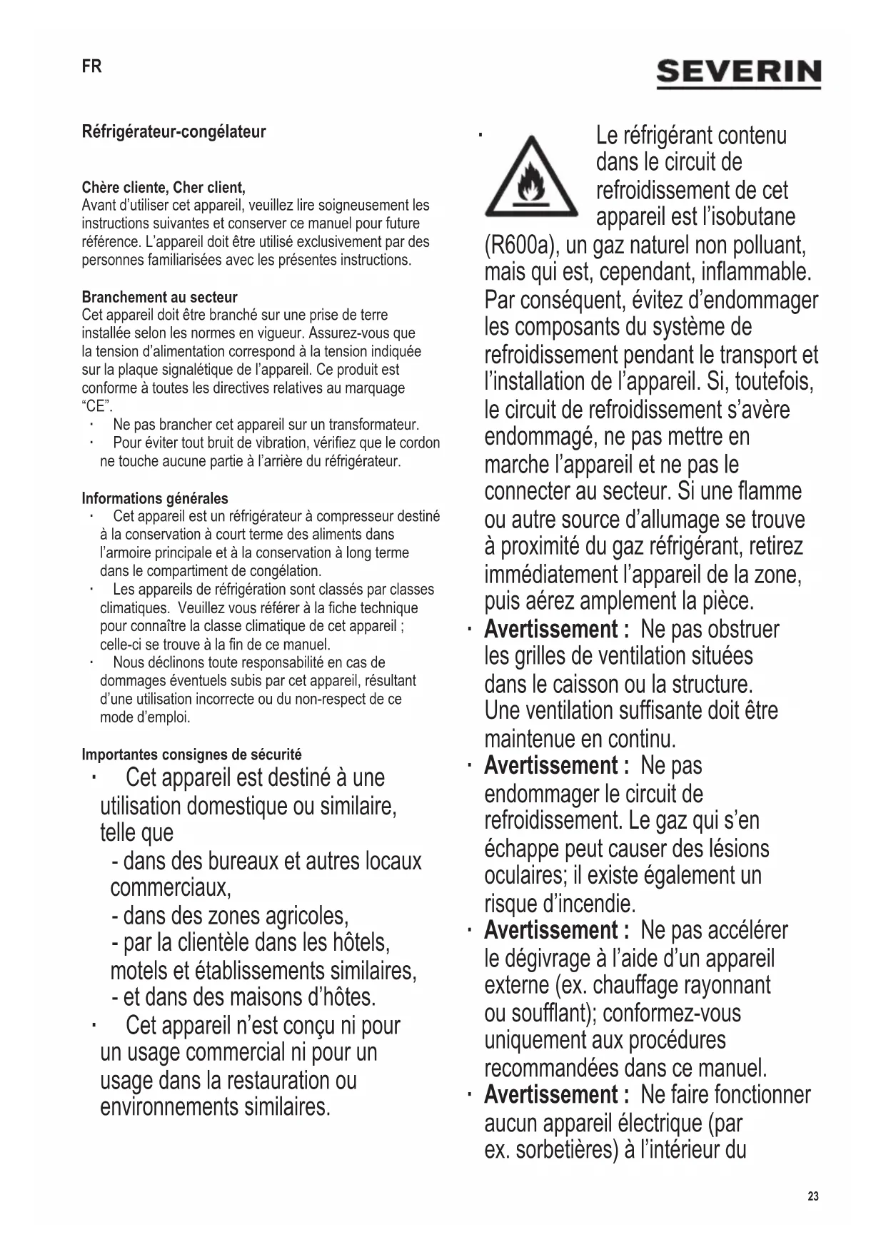 Le réfrigérant contenu dans le circuit de refroidissement de cet appareil est l’isobutane (R600a), un gaz naturel non polluant, mais qui est, cependant, inammable. Par conséquent, évitez d’endommager les composants du système de refroidissement pendant le transport et l’installation de l’appareil. Si, toutefois, le circuit de refroidissement s’avère endommagé, ne pas mettre en marche l’appareil et ne pas le connecter au secteur. Si une amme ou autre source d’allumage se trouve à proximité du gaz réfrigérant, retirez immédiatement l’appareil de la zone, puis aérez amplement la pièce. ∙ Avertissement : Ne pas obstruer les grilles de ventilation situées dans le caisson ou la structure. Une ventilation sufsante doit être maintenue en continu. ∙ Avertissement : Ne pas endommager le circuit de refroidissement. Le gaz qui s’en échappe peut causer des lésions oculaires; il existe également un risque d’incendie. ∙ Avertissement : Ne pas accélérer le dégivrage à l’aide d’un appareil externe (ex. chauffage rayonnant ou soufant); conformez-vous uniquement aux procédures recommandées dans ce manuel. ∙ Avertissement : Ne faire fonctionner aucun appareil électrique (par ex. sorbetières) à l’intérieur du FR24 142 x 208 mm compartiment de conservation à moins que celui-ci ne soit spéciquement permis dans ces instructions. ∙ Avant de le brancher sur le secteur, vériez minutieusement l’appareil, y compris le cordon d’alimentation, pour tout signe de dommages survenus pendant le transport. Au cas où un dommage aurait été détecté, ne pas brancher l’appareil sur le secteur. ∙ Lors de la mise en place de l’appareil veuillez vous assurer que le câble de raccordement n’est pas coincé et qu’il ne risque pas d’être endommagé. ∙ Veuillez ne pas placer de prises multiples mobiles ou blocs d’alimentation à l’arrière de l’appareil. ∙ Cet appareil n’est pas conçu pour la conservation des liquides explosifs tels que les aérosols à gaz propulseur. ∙ En cas de vente ou cession de l’appareil à un tiers, ou sa remise à un centre de recyclage agréé, il est important de signaler la présence de la matière isolante ‘cyclopentane’ et également du réfrigérant R600a. ∙ An de se conformer aux normes de sécurité en vigueur et d’éviter tout risque, la réparation ou la modication de cet appareil, y compris le remplacement du cordon d’alimentation, doit être effectuée par un de nos agents agréés. ∙ Cet appareil peut être utilisé par des enfants (à partir de 8 ans) et par des personnes souffrant de déciences physiques, sensorielles ou mentales, ou manquant d’expérience ou de connaissances, s’ils ont été formés à l’utilisation de l’appareil et ont été supervisés, et s’ils en comprennent les dangers et les précautions de sécurité à prendre. ∙ Les enfants entre 3 et 8 ans sont autorisés à charger et décharger le réfrigérateur/congélateur. ∙ Les enfants ne sont pas autorisés à jouer avec l’appareil. ∙ Les enfants ne doivent pas procéder à des travaux de maintenance ou de nettoyage sur l’appareil à moins d’être surveillés. ∙ Pour un nettoyage fréquent, nous vous conseillons d’utiliser de l’eau tiède additionnée d’un détergent doux. Pour des informations détaillées concernant le nettoyage de l’appareil, veuillez vous référer au paragraphe Dégivrage et nettoyage. ∙ Pour des informations détaillées concernant le remplacement de LED, veuillez vous référer au paragraphe Eclairage intérieur. An d’éviter la contamination des aliments veuillez respecter les consignes suivantes : ∙ Lorsqu’une porte est ouverte longtemps, une augmentation signicative de la température dans les compartiments de l’appareil peut survenir. ∙ Toute surface étant en contact avec des aliments et les systèmes de drainage accessibles doivent être nettoyées régulièrement. ∙ Veuillez ne conserver de la viande25 142 x 208 mm crue et du poisson que dans des récipients adéquats dans le réfrigérateur pour éviter tout contact avec d’autres aliments. ∙ Si le réfrigérateur/congélateur reste vide pendant une période prolongée, veuillez éteindre l’appareil, le nettoyer et laisser la porte ouverte an d’éviter la formation de moisissures. Conservation des aliments ∙ Un réfrigérateur comporte plusieurs zones dont la température est différente. La zone la plus chaude se trouve autour de la porte en haut et la zone la plus froide se situe vers le fond et en bas de la cuve. ∙ De ce fait, les aliments doivent être conservés de la façon suivante : ∙ Sur les étagères principales (de haut en bas): les pâtisseries, repas pré cuisinés, produits laitiers, viande, poisson, charcuterie et saucisses. ∙ Dans le bac à légumes: légumes, salade et fruits. ∙ Dans la porte (de haut en bas): beurre, fromage, oeufs, tubes (par ex. la moutarde), petites bouteilles, grandes bouteilles, lait et cartons de jus de fruit. ∙ Pour prévenir tout risque de blessure corporelle ou de dommage au congélateur, l’appareil doit être transporté uniquement dans son emballage d’origine. ∙ Attention : Tenez les enfants à l’écart des emballages, qui représentent un risque potentiel, par exemple, de suffocation. ∙ Le givre issu du dégivrage est impropre à la consommation. ∙ Examinez régulièrement le cordon pour vous assurer de son parfait état. Ne pas utiliser l’appareil si le cordon est endommagé. ∙ Pour éviter tout risque d’incendie, ne placez aucun appareil thermoélectrique sur le congélateur. Ne placez aucun récipient contenant des liquides sur l’appareil : ceci an d’éviter tout risque de fuite ou de renversement de liquide qui pourrait endommager l’isolation électrique. ∙ Cet appareil est conçu uniquement pour la conservation des aliments. ∙ Les substances alcooliques doivent être conservées dans d