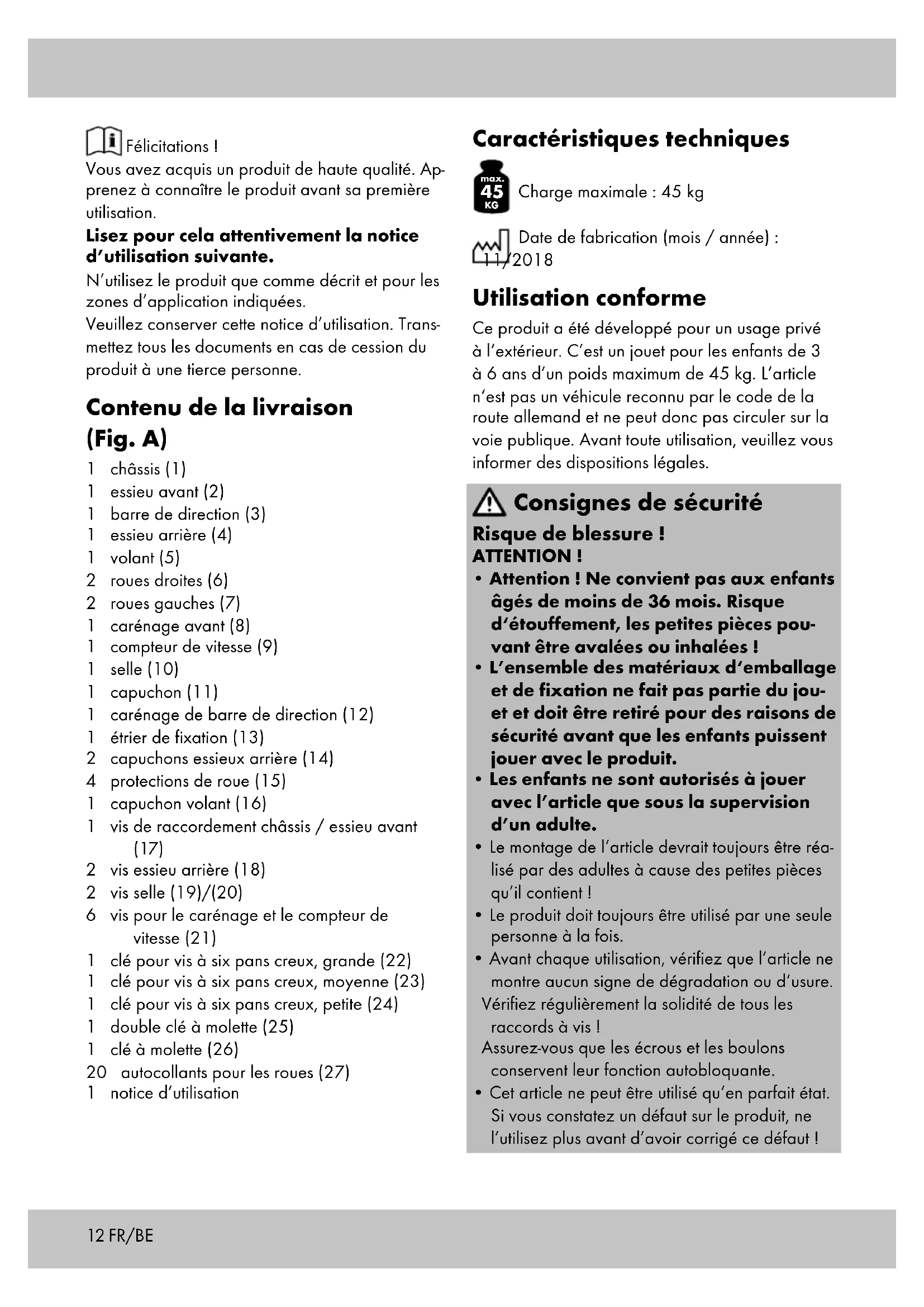 Charge maximale : 45 kg Date de fabrication (mois / année) : 11/2018 Utilisation conforme Ce produit a été développé pour un usage privé à l‘extérieur. C’est un jouet pour les enfants de 3 à 6 ans d’un poids maximum de 45 kg. L‘article n‘est pas un véhicule reconnu par le code de la route allemand et ne peut donc pas circuler sur la voie publique. Avant toute utilisation, veuillez vous informer des dispositions légales. Consignes de sécurité Risque de blessure ! ATTENTION !