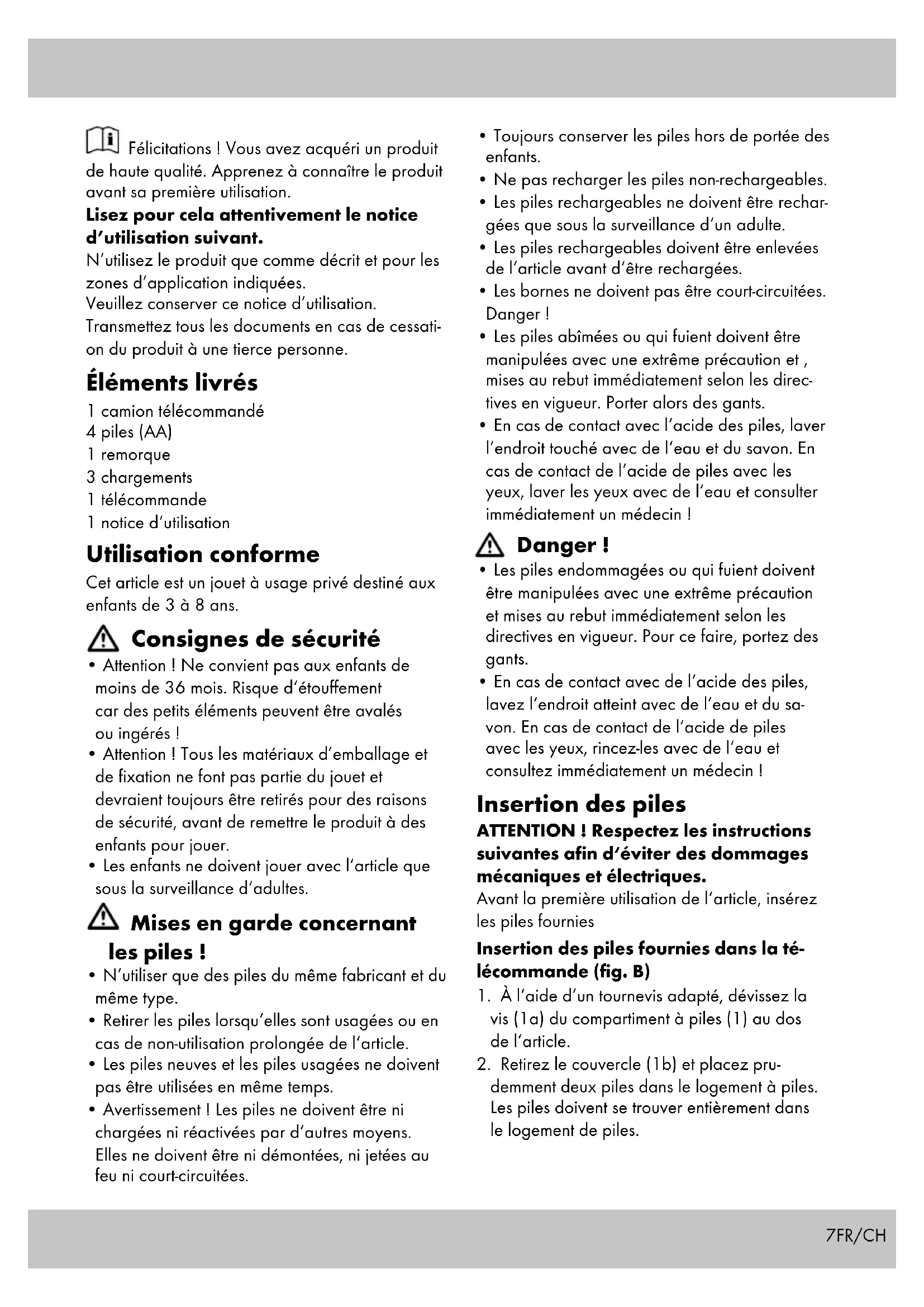 - mit Scan & Play eine aufregende 3D-Welt. DE/AT/CH7FR/CH Félicitations ! Vous avez acquéri un produit de haute qualité. Apprenez à connaître le produit avant sa première utilisation. Lisez pour cela attentivement le notice d’utilisation suivant. N’utilisez le produit que comme décrit et pour les zones d’application indiquées. Veuillez conserver ce notice d’utilisation. Transmettez tous les documents en cas de cessati- on du produit à une tierce personne. Éléments livrés 1 camion télécommandé 4 piles (AA) 1 remorque 3 chargements 1 télécommande 1 notice d‘utilisation Utilisation conforme Cet article est un jouet à usage privé destiné aux enfants de 3 à 8 ans. Consignes de sécurité