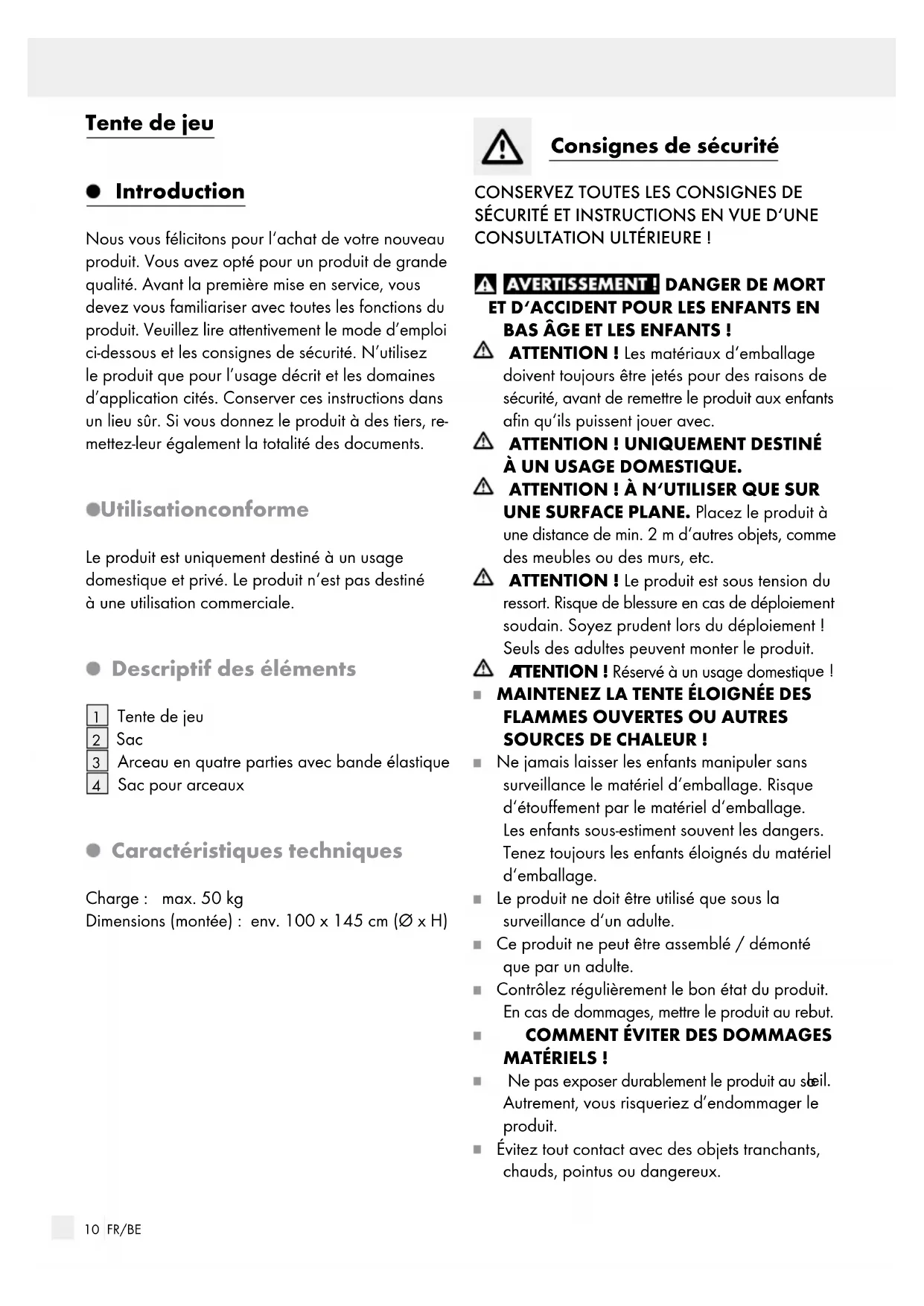 funktionsfejl eller andre mangler, skal De først kon- takte nedenstående serviceafdeling telefonisk eller via e-mail. Et produkt, der er registreret som defekt, kan De der- efter sende portofrit til den meddelte serviceadresse ved vedlæggelse af købsbeviset (kassebon) og an- givelsen af, hvori manglen består, og hvornår den er opstået. Service Service Danmark Tel.: 32 710005 E-Mail: owim@lidl.dk10 FR/BE Tente de jeu Introduction Nous vous félicitons pour l‘achat de votre nouveau produit. Vous avez opté pour un produit de grande qualité. Avant la première mise en service, vous devez vous familiariser avec toutes les fonctions du produit. Veuillez lire attentivement le mode d’emploi ci-dessous et les consignes de sécurité. N’utilisez le produit que pour l’usage décrit et les domaines d’application cités. Conserver ces instructions dans un lieu sûr. Si vous donnez le produit à des tiers, re- mettez-leur également la totalité des documents. Utilisation conforme Le produit est uniquement destiné à un usage domestique et privé. Le produit n‘est pas destiné à une utilisation commerciale. Descriptif des éléments