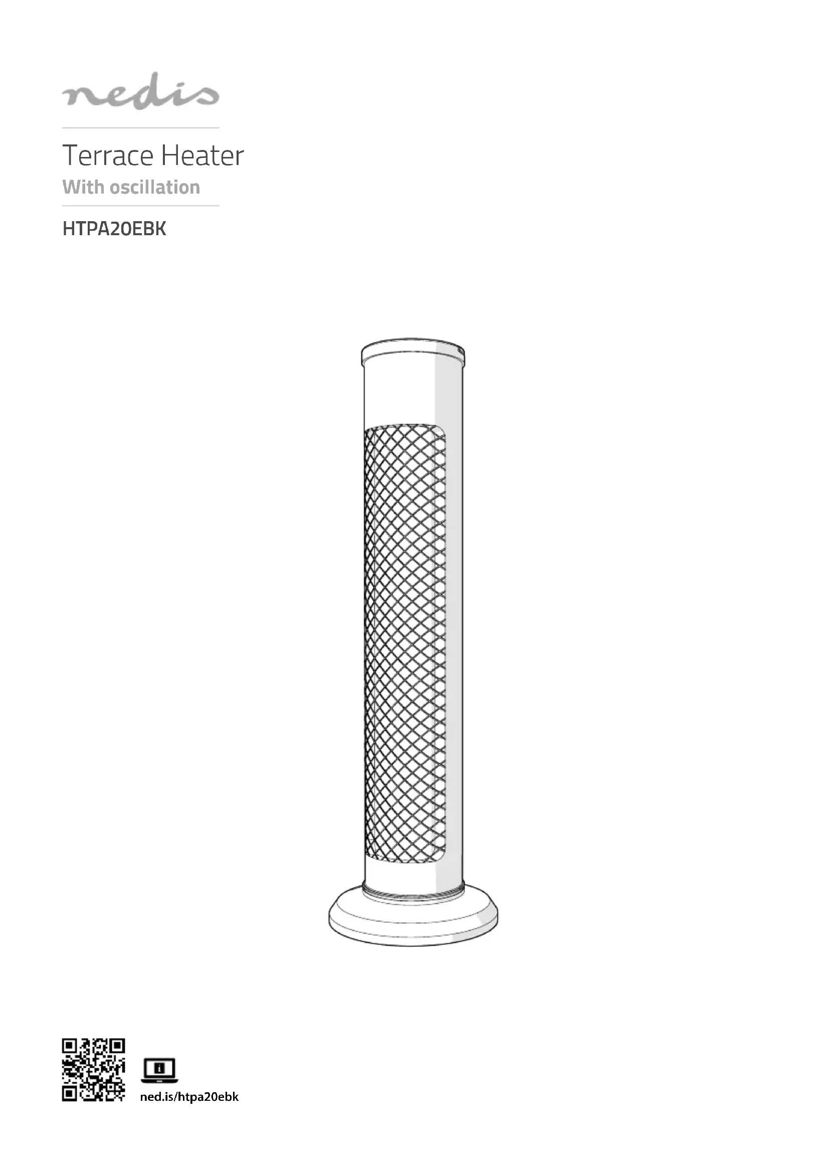 Guide de démarrage rapide Chauage de terrasse HTPA20EBKPour plus d'informations, consultez le manuel détaillé en ligne : ned.is/htpa20ebk Utilisation prévue Le Nedis HTPA20EBK est un convecteur avec 2 réglages de température.Ce produit n’est pas destiné à un usage professionnel.Le couvercle de protection de ce produit est destiné à empêcher un accès direct aux éléments chauants et doit être en place lorsque l’appareil de chauage est en cours d’utilisation.Toute modication du produit peut avoir des conséquences sur la sécurité, la garantie et le bon fonctionnement. Spécications Produit Chauage de terrasseArticle numéro HTPA20EBKDimensions (L x l x H) 27 x 27 x 82 cmPoids 3 kgTension d’entrée 220 – 240 V ~ 50 HzPuissance de sortie maximale 1200 WClassement IP IP24Longueur de câble 1,4 m Pièces principales (image A) 1 Unité de chauage2 Élément chauant3 Couvercle de protection4 Support de la base5 Câble d'alimentation6 Poignée7 Cadran de fonction7