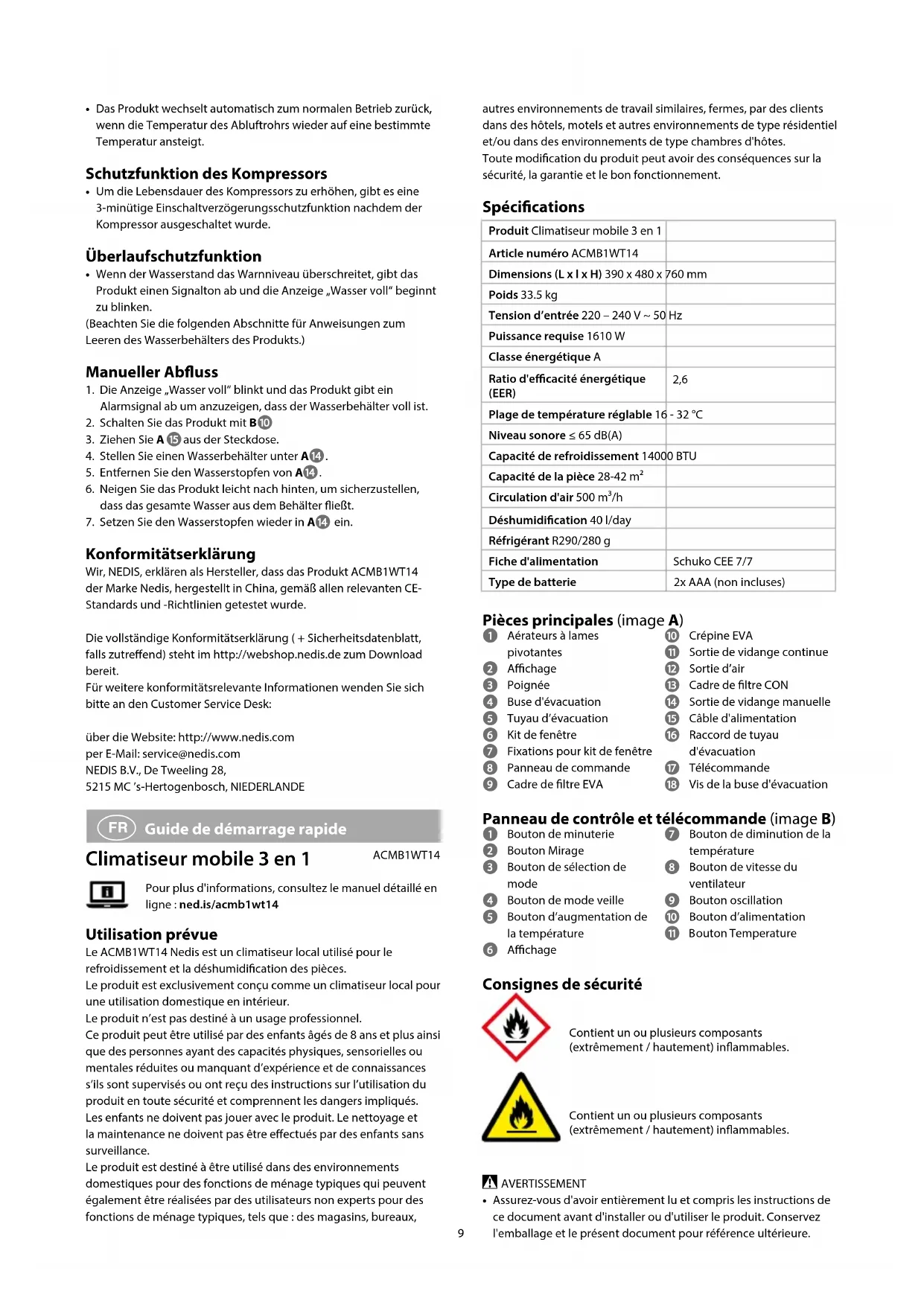 Guide de démarrage rapide Climatiseur mobile 3 en 1 ACMB1WT14Pour plus d'informations, consultez le manuel détaillé en ligne : ned.is/acmb1wt14 Utilisation prévue Le ACMB1WT14 Nedis est un climatiseur local utilisé pour le refroidissement et la déshumidication des pièces.Le produit est exclusivement conçu comme un climatiseur local pour une utilisation domestique en intérieur.Le produit n’est pas destiné à un usage professionnel.Ce produit peut être utilisé par des enfants âgés de 8 ans et plus ainsi que des personnes ayant des capacités physiques, sensorielles ou mentales réduites ou manquant d’expérience et de connaissances s’ils sont supervisés ou ont reçu des instructions sur l’utilisation du produit en toute sécurité et comprennent les dangers impliqués. Les enfants ne doivent pas jouer avec le produit. Le nettoyage et la maintenance ne doivent pas être eectués par des enfants sans surveillance.Le produit est destiné à être utilisé dans des environnements domestiques pour des fonctions de ménage typiques qui peuvent également être réalisées par des utilisateurs non experts pour des fonctions de ménage typiques, tels que : des magasins, bureaux,10