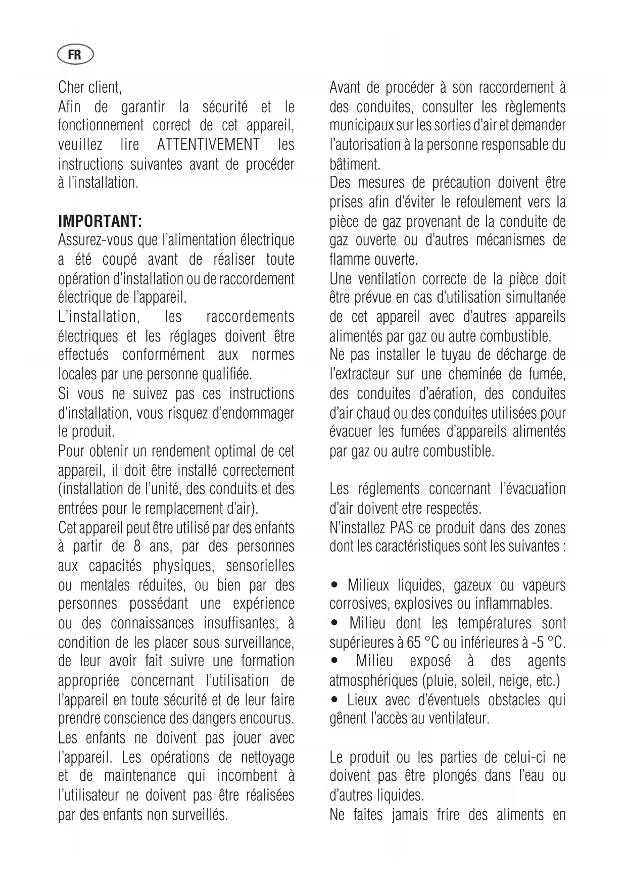 - El aparato no precisa mantenimiento adicional. Solicite siempre repuestos originales para reparaciones. Si necesita algún tipo de asistencia técnica o desea más información sobre nuestros productos, no dude en contactar con nuestro distribuidor oficial. El FABRICANTE se reserva el derecho de efectuar cualquier mejora tecnológica o modificación sin previo aviso.Cher client, Afin de garantir la sécurité et le fonctionnement correct de cet appareil, veuillez lire ATTENTIVEMENT les instructions suivantes avant de procéder à l’installation. IMPORTANT: Assurez-vous que l’alimentation électrique a été coupé avant de réaliser toute opération d’installation ou de raccordement électrique de l’appareil. L’installation, les raccordements électriques et les réglages doivent être effectués conformément aux normes locales par une personne qualifiée. Si vous ne suivez pas ces instructions d’installation, vous risquez d’endommager le produit. Pour obtenir un rendement optimal de cet appareil, il doit être installé correctement (installation de l’unité, des conduits et des entrées pour le remplacement d’air). Cet appareil peut être utilisé par des enfants à partir de 8 ans, par des personnes aux capacités physiques, sensorielles ou mentales réduites, ou bien par des personnes possédant une expérience ou des connaissances insuffisantes, à condition de les placer sous surveillance, de leur avoir fait suivre une formation appropriée concernant l’utilisation de l’appareil en toute sécurité et de leur faire prendre conscience des dangers encourus. Les enfants ne doivent pas jouer avec l’appareil. Les opérations de nettoyage et de maintenance qui incombent à l’utilisateur ne doivent pas être réalisées par des enfants non surveillés. Avant de procéder à son raccordement à des conduites, consulter les règlements municipaux sur les sorties d’air et demander l’autorisation à la personne responsable du bâtiment. Des mesures de précaution doivent être prises afin d’éviter le refoulement vers la pièce de gaz provenant de la conduite de gaz ouverte ou d’autres mécanismes de flamme ouverte. Une ventilation correcte de la pièce doit être prévue en cas d’utilisation simultanée de cet appareil avec d’autres appareils alimentés par gaz ou autre combustible. Ne pas installer le tuyau de décharge de l’extracteur sur une cheminée de fumée, des conduites d’aération, des conduites d’air chaud ou des conduites utilisées pour évacuer les fumées d’appareils alimentés par gaz ou autre combustible. Les réglements concernant l’évacuation d’air doivent etre respectés. N’installez PAS ce produit dans des zones dont les caractéristiques sont les suivantes :