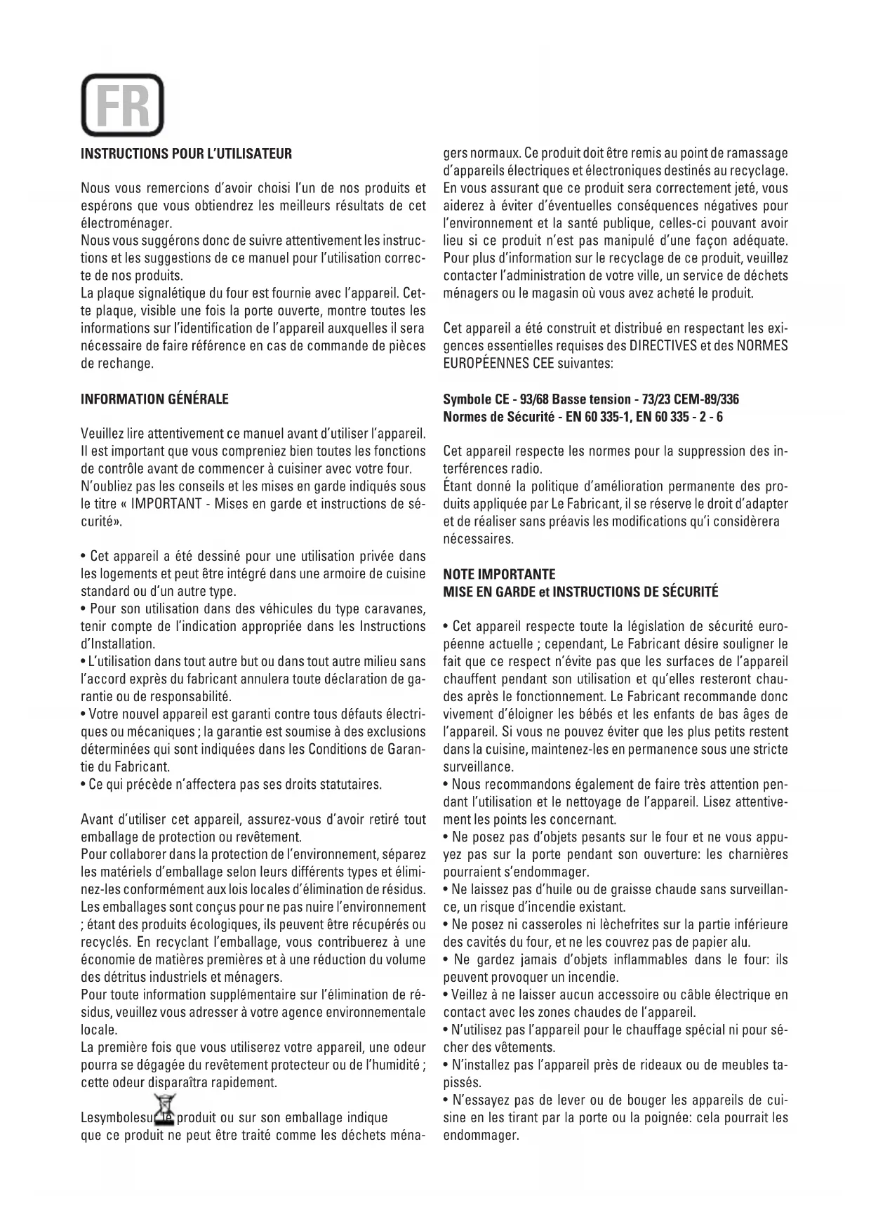 - Ce qui précède n’affectera pas ses droits statutaires. Avant d’utiliser cet appareil, assurez-vous d’avoir retiré tout emballage de protection ou revêtement. Pour collaborer dans la protection de l’environnement, séparez les matériels d’emballage selon leurs différents types et élimi- nez-les conformément aux lois locales d’élimination de résidus. Les emballages sont conçus pour ne pas nuire l’environnement ; étant des produits écologiques, ils peuvent être récupérés ou recyclés. En recyclant l’emballage, vous contribuerez à une économie de matières premières et à une réduction du volume des détritus industriels et ménagers. Pour toute information supplémentaire sur l’élimination de ré- sidus, veuillez vous adresser à votre agence environnementale locale. La première fois que vous utiliserez votre appareil, une odeur pourra se dégagée du revêtement protecteur ou de l’humidité ; cette odeur disparaîtra rapidement. Le symbole sur le produit ou sur son emballage indique que ce produit ne peut être traité comme les déchets ména- gers normaux. Ce produit doit être remis au point de ramassage d’appareils électriques et électroniques destinés au recyclage. En vous assurant que ce produit sera correctement jeté, vous aiderez à éviter d’éventuelles conséquences négatives pour l’environnement et la santé publique, celles-ci pouvant avoir lieu si ce produit n’est pas manipulé d’une façon adéquate. Pour plus d’information sur le recyclage de ce produit, veuillez contacter l’administration de votre ville, un service de déchets ménagers ou le magasin où vous avez acheté le produit. Cet appareil a été construit et distribué en respectant les exi- gences essentielles requises des DIRECTIVES et des NORMES EUROPÉENNES CEE suivantes: Symbole CE - 93/68 Basse tension - 73/23 CEM-89/336 Normes de Sécurité - EN 60 335-1, EN 60 335 - 2 - 6 Cet appareil respecte les normes pour la suppression des in- terférences radio. Étant donné la politique d’amélioration permanente des pro- duits appliquée par Le Fabricant, il se réserve le droit d’adapter et de réaliser sans préavis les modications qu’i considèrera nécessaires. NOTE IMPORTANTE MISE EN GARDE et INSTRUCTIONS DE SÉCURITÉ