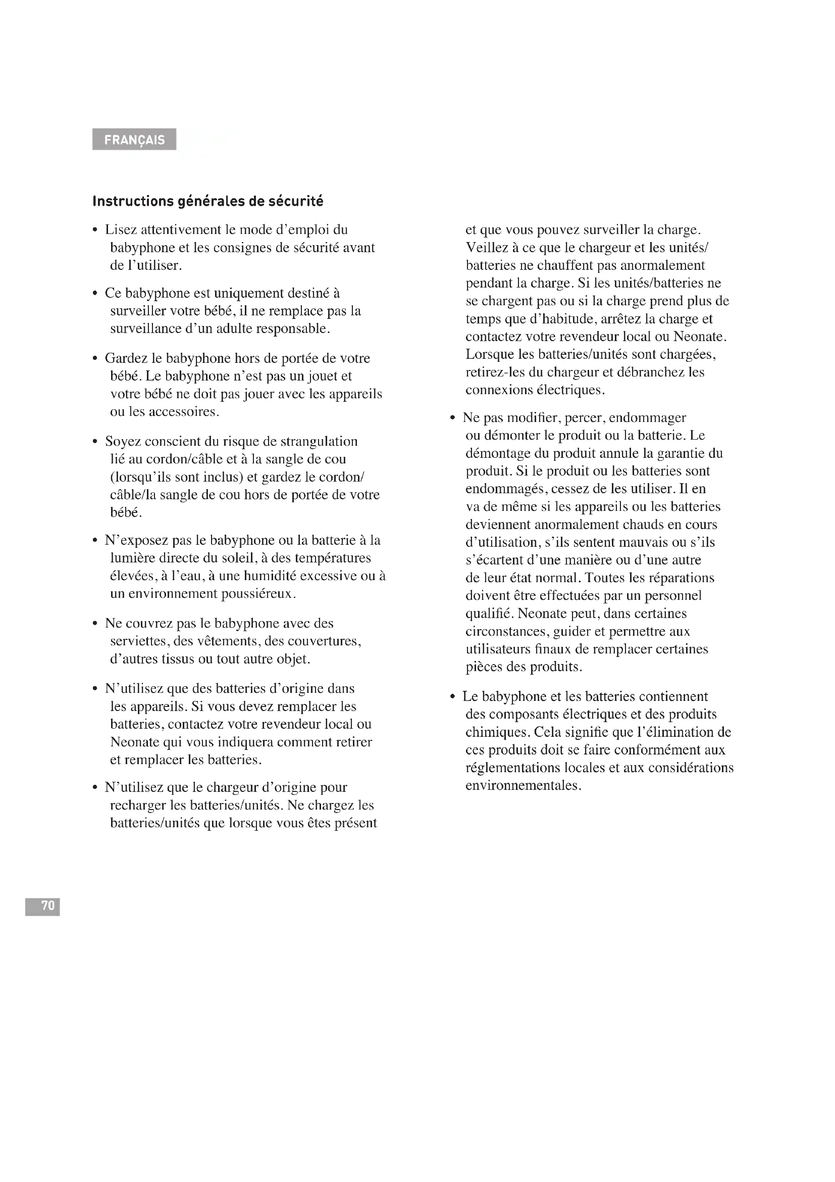 - Ne rechargez pas la batterie à plus que 100 %. Il est conseillé de remplacer la batterie après 600 chargements. Toutes les batteries de Neonate sont garanties pour une période de 2 ans. Informations sur le retrait en toute sécu- rité des batteries ou des accumulateurs Retirez le couvercle arrière de l’appareil dont vous souhaitez retirer l’accumulateur. Soulevez doucement la batterie sans tirer sur les ls. Saisissez le l entre la batterie et le connecteur de batterie blanc dans le compartiment de la batterie. Tirez délicatement sur les ls pour les étirer et exercez une pression sur le connecteur de batterie blanc. Assurez-vous de ne pas tirer sur les ls qui se trouvent sur la batterie elle- même. Le connecteur de batterie à l’extrémité du l doit maintenant se désengager de la carte PCB dans le compartiment de la batterie. Cet appareil électrique contient les batteries ou accumulateurs suivant(e)s Type de batterie Batterie rechargeable lithium-ion polymère Système chimique Dioxyde de cobalt-lithium et graphite72 FRANÇAIS Appairage (connexion) des unités/décon- nexion des unités appairées Attention ! L’unité parents (UP) et l’unité bébé (UB) sont appairées par le fabricant et fournies prêtes à l’emploi. Cependant, nous vous recom- mandons d’appairer à nouveau les unités an de garantir une connexion privée entre elles. Si vous appairez une nouvelle unité bébé à l’unité parents, il est nécessaire d’appairer les unités à nouveau. Assurez-vous que : l’unité bébé est éteinte. l’unité parents est allumée. les touches tactiles sont activées (presser la touche ON/OFF pour les activer et désactiver). Unité bébé : maintenir la touche (POWER) appuyée pendant 6 secondes jusqu’à ce que le symbole « CONNEXION » clignote rapidement (le symbole « CONNEXION » clignote rapidement pendant 30 secondes pour indiquer que l’appairage est possible). Unité parents : maintenir la touche (•) appuyée pendant 2 secondes an d’accéder au menu Unité parents : sélectionner CONNECTING en naviguant dans le menu à l’aide des touches (-/+) pour aller vers le haut et le bas respectivement, puis conrmer à l’aide de la touche (•). Pour attribuer un numéro à l’unité bébé, sélectionner BABY, activer la sélection en appuyant sur la touche (•), puis sélectionner le numéro à l’aide des touches (-/+) et conrmer à l’aide de la touche (•) (attribuer un nouveau numéro à l’unité bébé n’est pas obligatoire si le numéro indiqué en face de BABY dans le menu vous convient). Unité parents : sélectionner CONNECTED en utilisant les touches (-/+) pour naviguer dans le menu, puis conrmer à l’aide de la touche (•). L’écran indique CONNECTED puis CONNECTING…, puis à nouveau CONNECTED une fois que les unités sont appairées et connectées. Répéter les étapes 1 à 4 pour appairer plusieurs unités bébé à la même unité parents. Pour appair- er plusieurs unités bébé à la même unité parents, il est obligatoire de leur attribuer des numéros différents à l’étape 3. Pour déconnecter une unité bébé appairée à une unité parents, répéter les étapes 2 à 4. À l’étape 4, lorsque vous conrmez à l’aide de la touche (•), l’écran indique CONNECTED puis DISCONNECTED.
