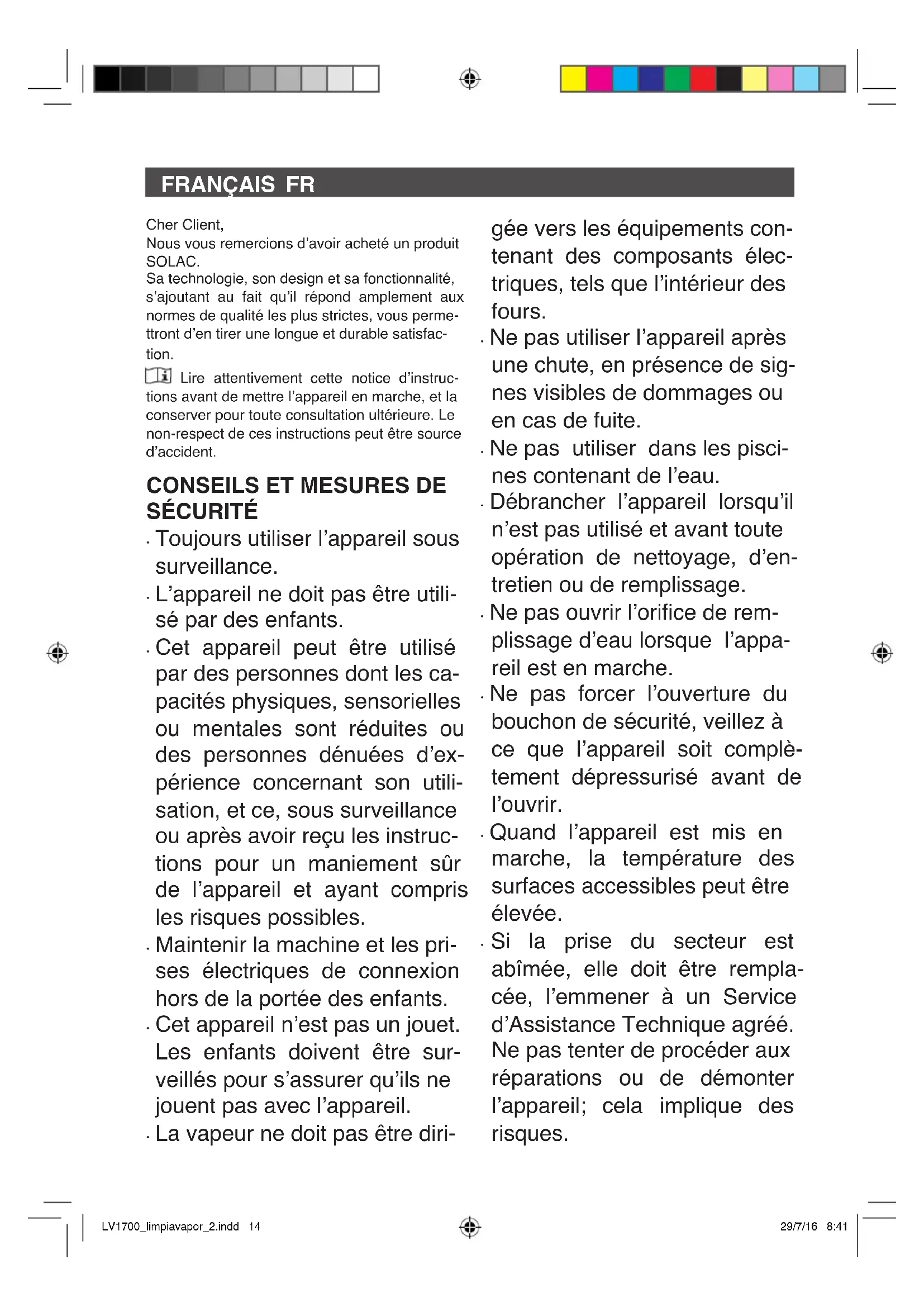 LV1700_limpiavapor_2.indd 12 29/7/16 8:41en read the operating instructions. This symbol means that user must to con- sult instructions thoroughly before use. This appliance complies with Directive 2014/35/ EC on Low Voltage, Directive 2014/30/EC on Electromagnetic Compatibility, Directive 2011/65/EU on the restrictions of the use of certain hazardous substances in electrical and electronic equipment and Directive 2009/125/ EC on the ecodesign requirements for ener- gy-related products. LV1700_limpiavapor_2.indd 13 29/7/16 8:41FRAnçAIS FR Cher Client, Nous vous remercions d’avoir acheté un produit SOLAC. Sa technologie, son design et sa fonctionnalité, s’ajoutant au fait qu’il répond amplement aux normes de qualité les plus strictes, vous perme- ttront d’en tirer une longue et durable satisfac- tion. Lire attentivement cette notice d’instruc- tions avant de mettre l’appareil en marche, et la conserver pour toute consultation ultérieure. Le non-respect de ces instructions peut être source d’accident. cOnSeILS et MeSuReS de SécuRIté
