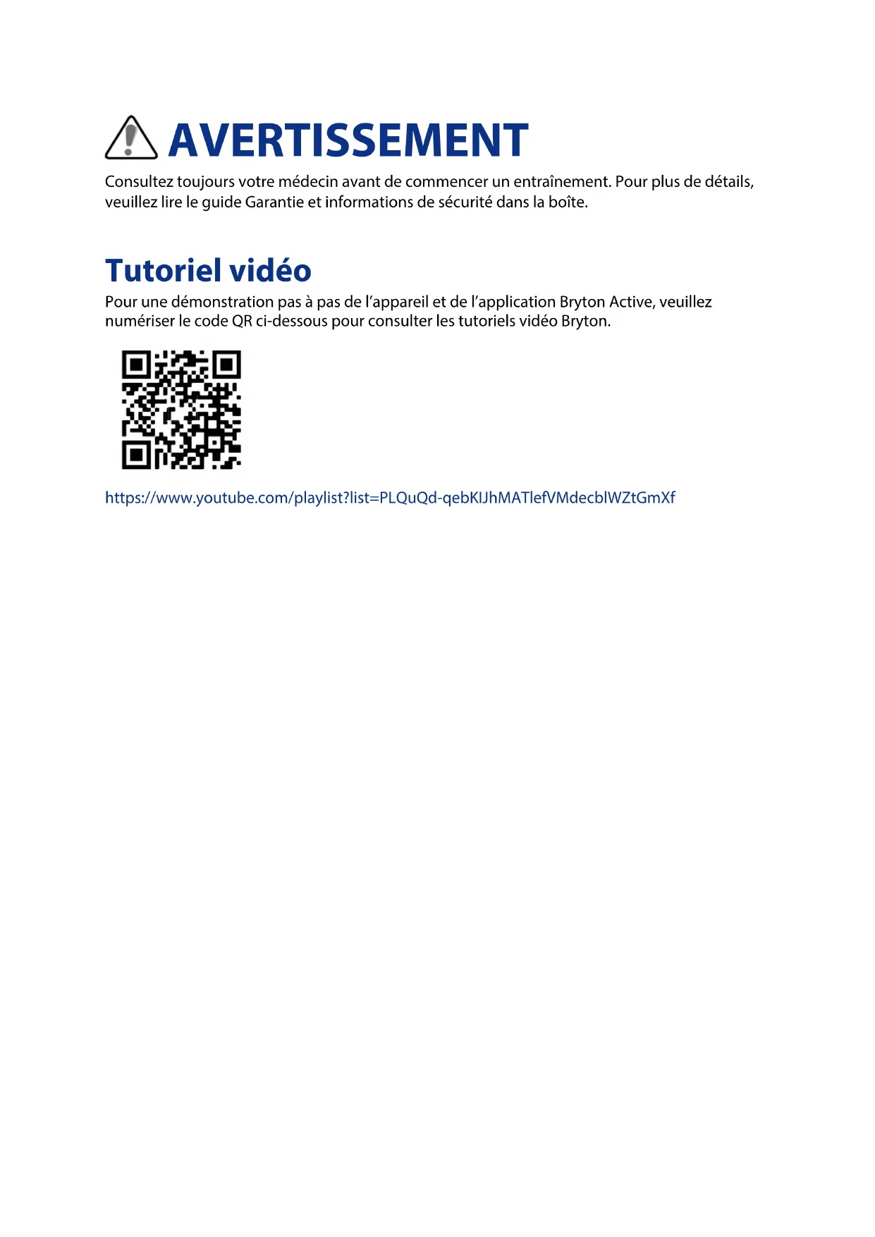 - Champs de données AVERTISSEMENT Consultez toujours votre médecin avant de commencer un entraînement. Pour plus de détails, veuillez lire le guide Garantie et informations de sécurité dans la boîte. Tutoriel vidéo Pour une démonstration pas à pas de l’appareil et de l’application Bryton Active, veuillez numériser le code QR ci-dessous pour consulter les tutoriels vidéo Bryton. https://www.youtube.com/playlist?list=PLQuQd-qebKIJhMATlefVMdecblWZtGmXf4Commencer Commencer Cette section vous aide concernant les préparations de base à eectuer avant de commencer à utiliser votre Rider 320. Votre Rider 320 p. 43