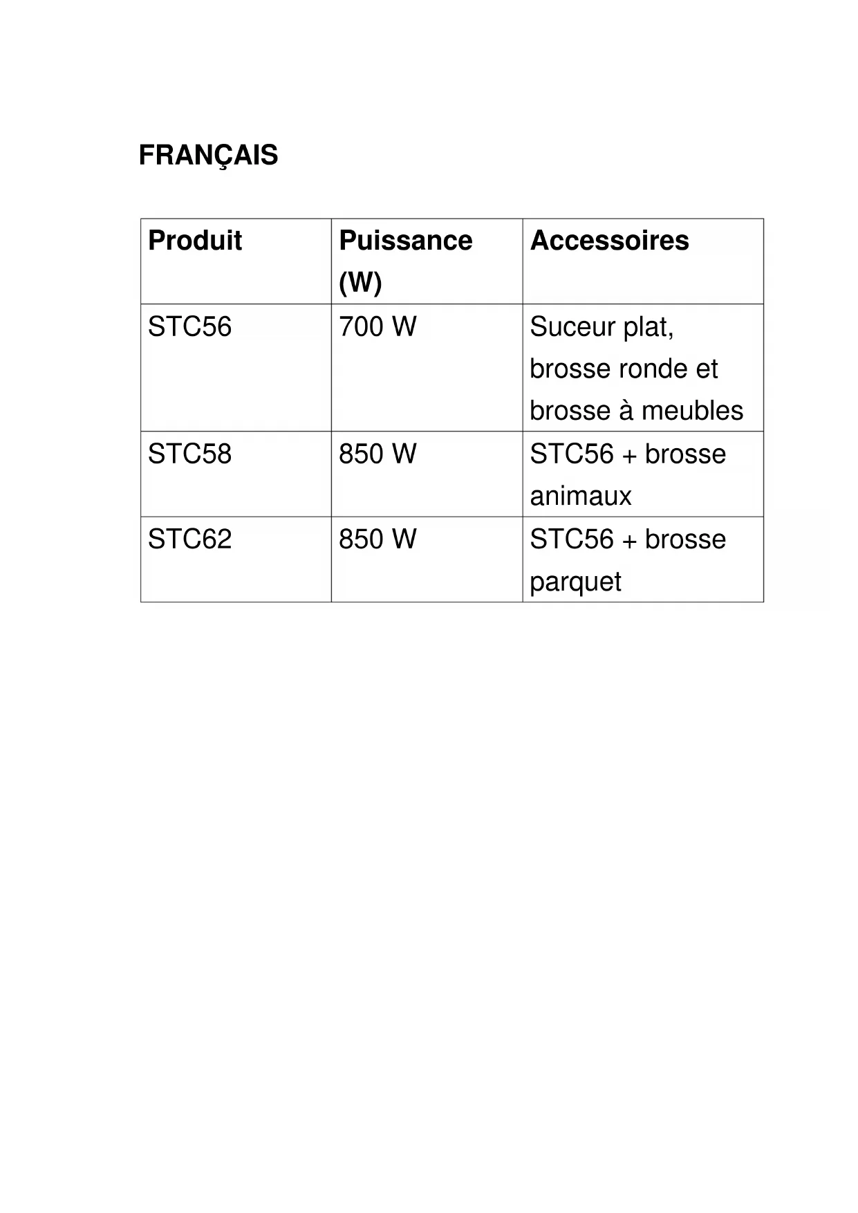 Produit Puissance (W) Accessoires STC56 700 W Suceur plat, brosse ronde et brosse à meubles STC58 850 W STC56 + brosse animaux STC62 850 W STC56 + brosse parquetDESCRIPTION DU PRODUIT