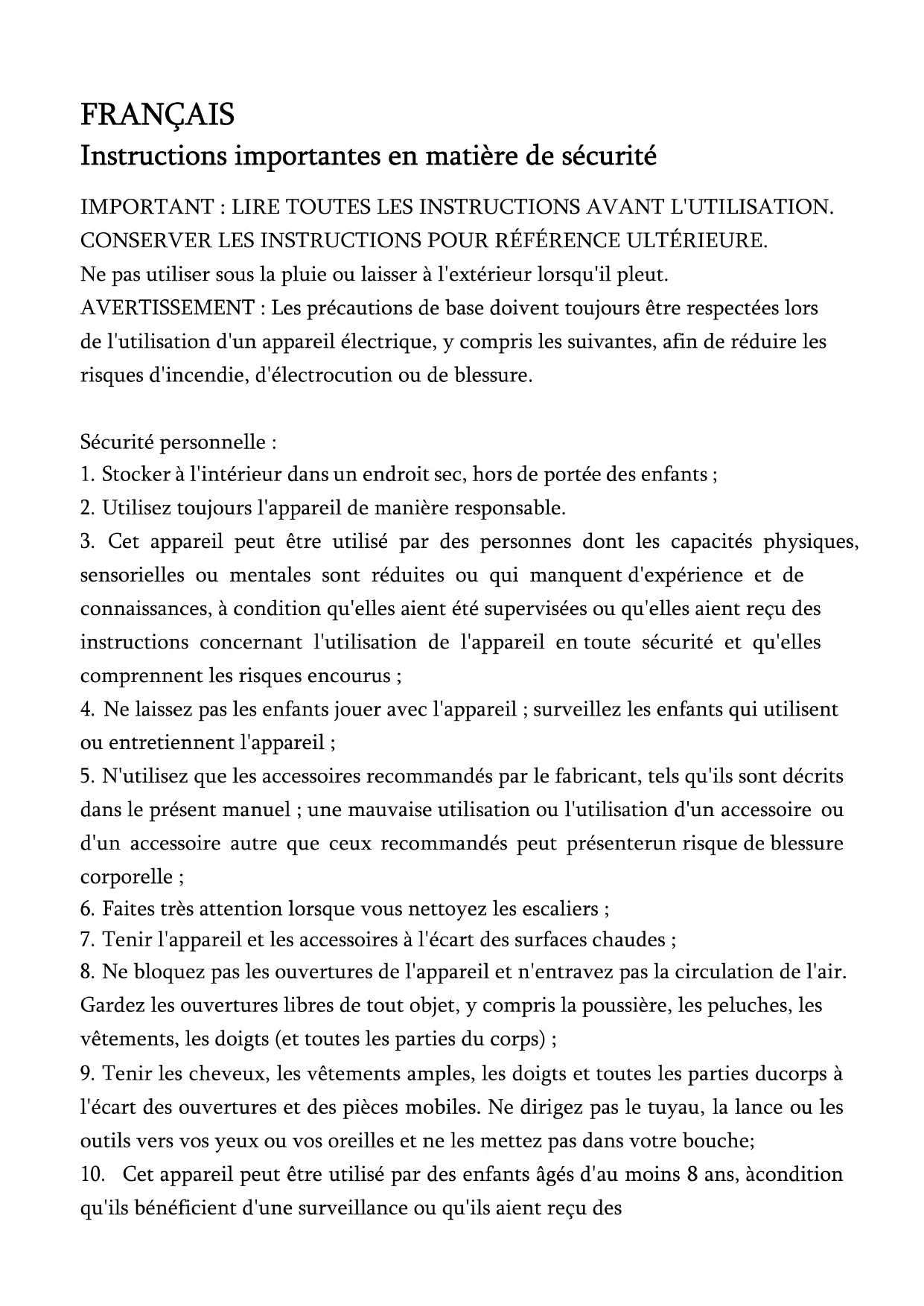 Cet appareil a été conçu pour l'aspiration domestique à sec uniquement ;