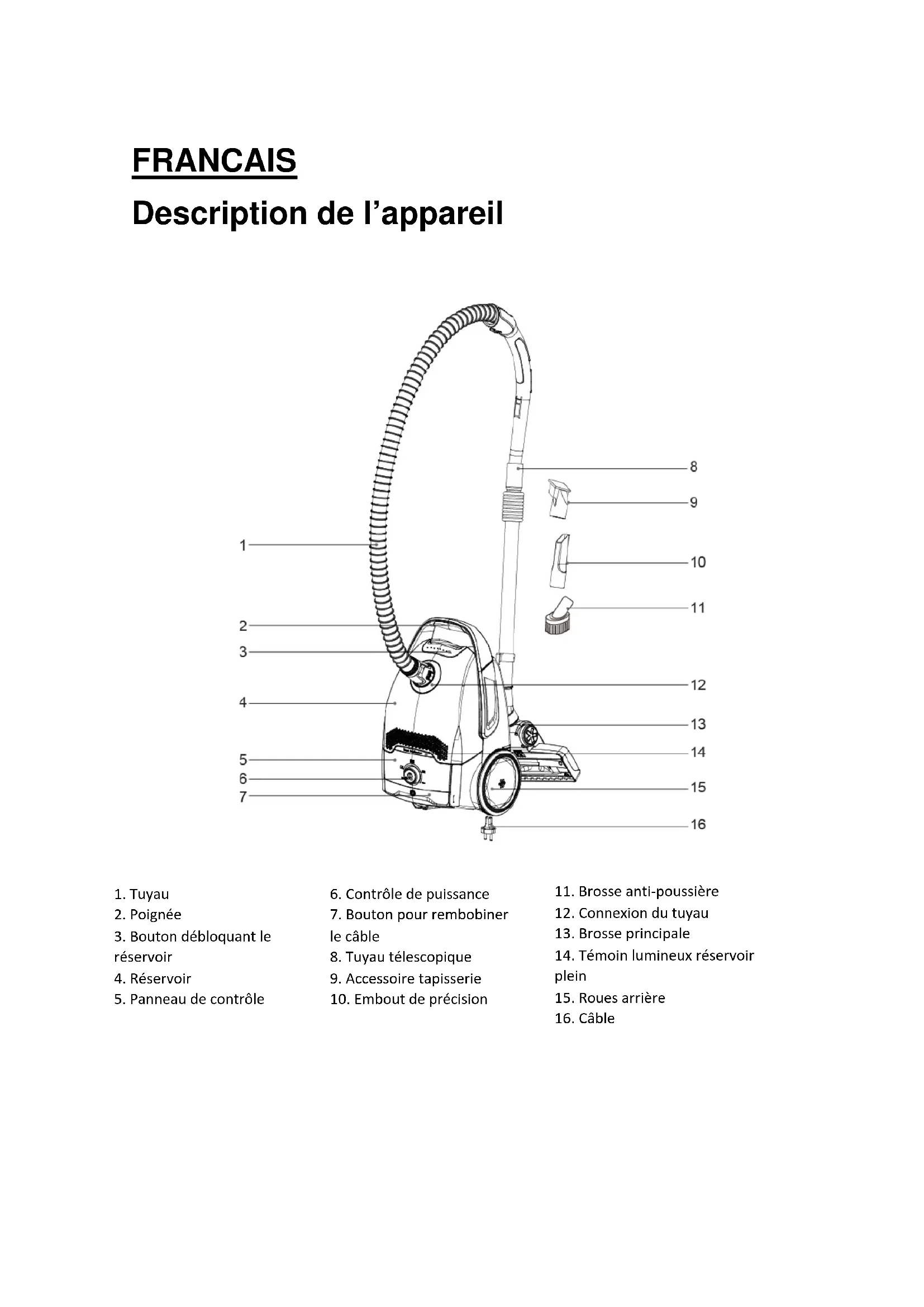 | Maintenance | Vider le réservoir après chaque utilisation, nettoyer le filtre tous les 6 mois. |