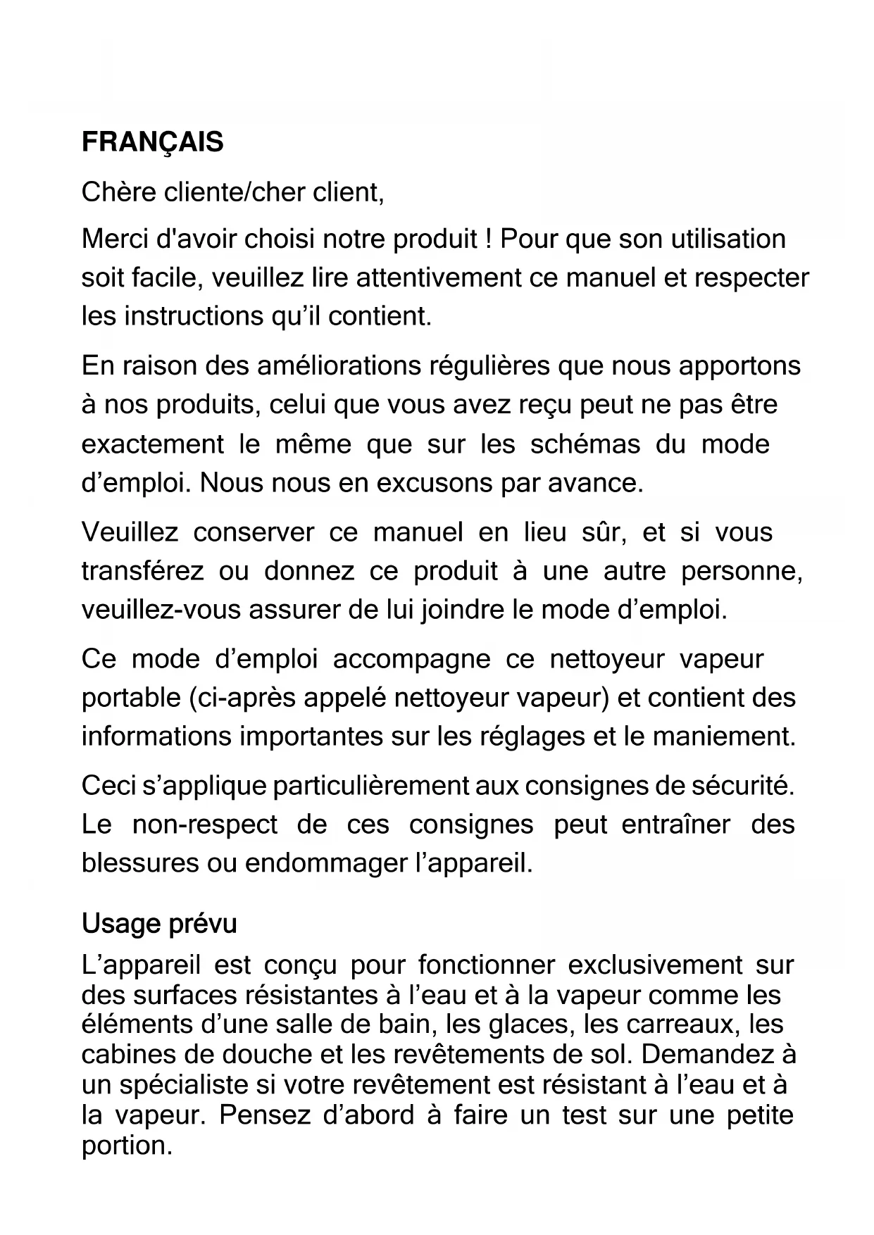 - Replacez l’appareil dans sa position de repos une fois qu’il ait refroidi complètement et qu’il n’y ait plus d’eau dans le réservoir.• Rangez l’appareil dans un endroit sec et propre qui soit hors de portée des enfants et des Animaux. Utilisation Le nettoyeur vapeur est uniquement conçu pour éliminer la saleté avec de la vapeur d’eau. Par exemple, il convient au nettoyage des zones suivantes : surfaces lisses (zones de travail, tuiles, carreaux émaillés, fenêtres ou miroirs), zones difficiles d’accès (recoins, joints, stores, WC, robinetterie) et textiles (rideaux, coussins, vêtements et sièges-auto). Le nettoyeur vapeur est uniquement destiné à un usage domestique et non commercial. Il n’est pas conçu pour être utilisé à l’extérieur ou avec d’autres liquides que l’eau. N’utilisez le nettoyeur vapeur que de la manière indiquée dans ce mode d’emploi. Toute autre utilisation est considérée inappropriée et peut entraîner des dommages matériels ou même des blessures. Le nettoyeur vapeur n’est pas un jouet pour les enfants. Le fabricant décline toute responsabilité pour les dommages causés par une utilisation incorrecte de l’appareil.