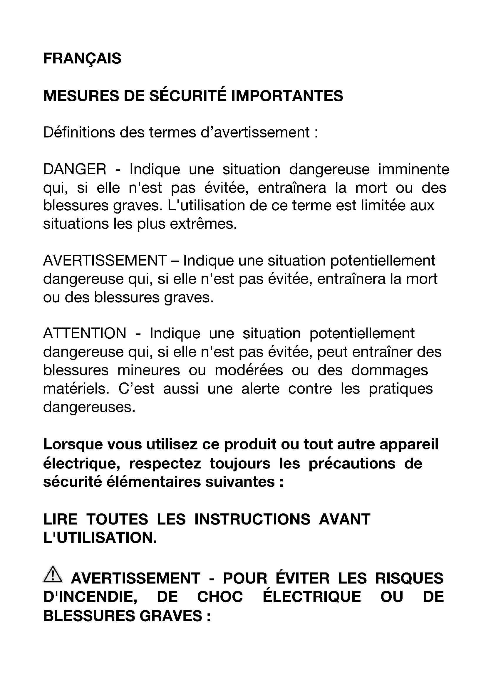 Définitions des termes d’avertissement : DANGER - Indique une situation dangereuse imminente qui, si elle n'est pas évitée, entraînera la mort ou des blessures graves. L'utilisation de ce terme est limitée aux situations les plus extrêmes. AVERTISSEMENT – Indique une situation potentiellement dangereuse qui, si elle n'est pas évitée, entraînera la mort ou des blessures graves. ATTENTION - Indique une situation potentiellement dangereuse qui, si elle n'est pas évitée, peut entraîner des blessures mineures ou modérées ou des dommages matériels. C’est aussi une alerte contre les pratiques dangereuses. Lorsque vous utilisez ce produit ou tout autre appareil électrique, respectez toujours les précautions de sécurité élémentaires suivantes :