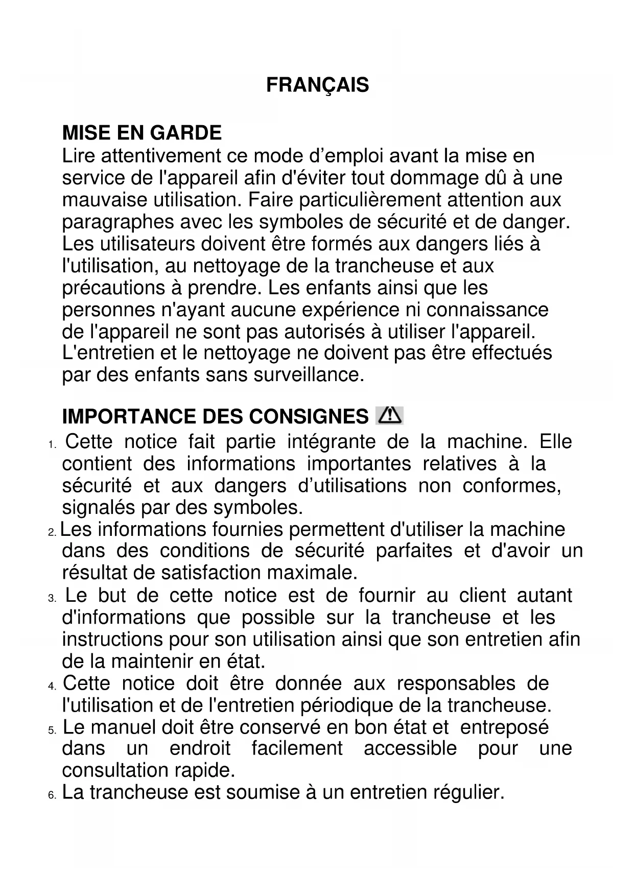 Lire attentivement ce mode d’emploi avant la mise en service de l'appareil afin d'éviter tout dommage dû à une mauvaise utilisation. Faire particulièrement attention aux paragraphes avec les symboles de sécurité et de danger. Les utilisateurs doivent être formés aux dangers liés à l'utilisation, au nettoyage de la trancheuse et aux précautions à prendre. Les enfants ainsi que les personnes n'ayant aucune expérience ni connaissance de l'appareil ne sont pas autorisés à utiliser l'appareil. L'entretien et le nettoyage ne doivent pas être effectués par des enfants sans surveillance.