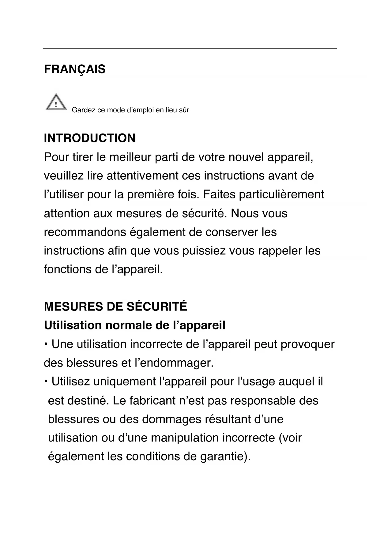 - Utilisez uniquement l'appareil pour l'usage auquel il est destiné. Le fabricant n’est pas responsable des blessures ou des dommages résultant d’une utilisation ou d’une manipulation incorrecte (voir également les conditions de garantie).• N’utilisez pas d’accessoires autres que ceux recommandés par le fabricant.