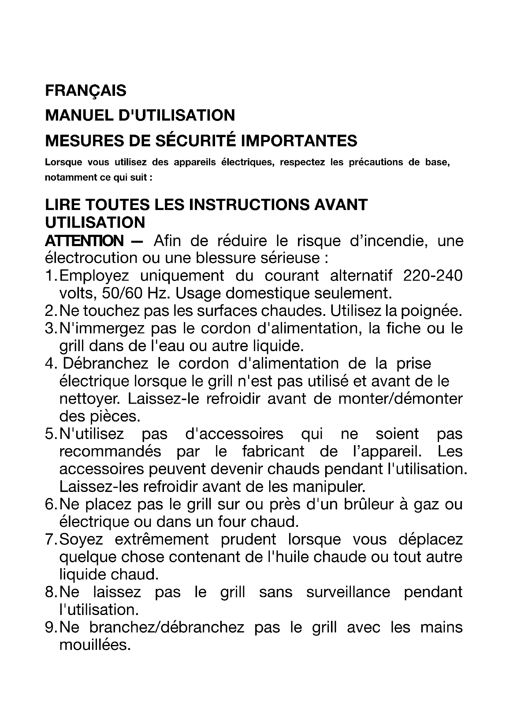 seulement. Elle n’a pas été conçue pour être utilisée dans les cas suivants qui ne sont pas couverts par la garantie : – dans des coins de cuisines réservés au personnel dans des magasins, bureaux et autres environnements professionnels, – dans des fermes auberges, – par les clients des hôtels, motels et autres environnements à caractère résidentiel, – dans des environnements de type chambres d’hôtes. MISE EN GARDE - Pour réduire les risques de blessures : - Ce produit est exclusivement destiné à un usage domestique et à l'intérieur d’un bâtiment non commercial et non industriel, pour la cuisson ou le chauffage d'aliments destinés à la consommation humaine. N'utilisez pas le grill à l'extérieur ou à d'autres fins. - Ne laissez pas le cordon d'alimentation pendre à des endroits où quelqu’un pourrait le tirer par mégarde (par exemple, au bord d'une table ou d'un comptoir), et nelaissez pas le cordon être en contact avec des surfaces chaudes. - Portez toujours des gants de protection ou résistants à la chaleur lorsque vous utilisez ce produit et utilisez des ustensiles. - Pour débrancher le grill d'une prise électrique, tirez directement sur la prise ; ne tirez pas sur le cordon d'alimentation. - Utilisez toujours le grill sur une surface plane, stable et résistante à la chaleur.