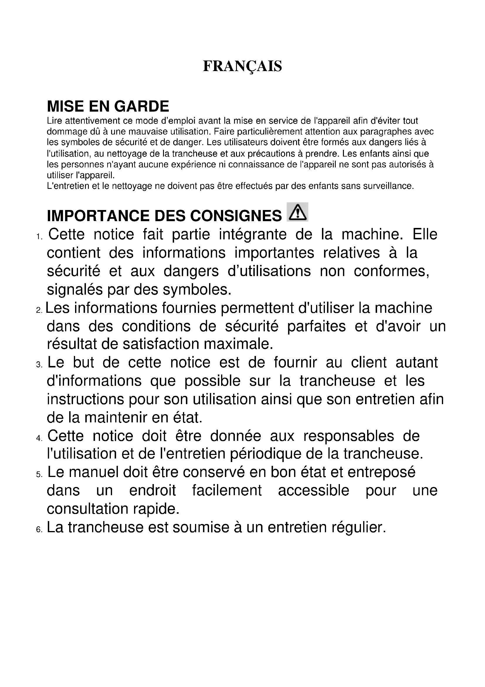 Lire attentivement ce mode d’emploi avant la mise en service de l'appareil afin d'éviter tout dommage dû à une mauvaise utilisation. Faire particulièrement attention aux paragraphes avec les symboles de sécurité et de danger. Les utilisateurs doivent être formés aux dangers liés à l'utilisation, au nettoyage de la trancheuse et aux précautions à prendre. Les enfants ainsi que les personnes n'ayant aucune expérience ni connaissance de l'appareil ne sont pas autorisés à utiliser l'appareil. L'entretien et le nettoyage ne doivent pas être effectués par des enfants sans surveillance.