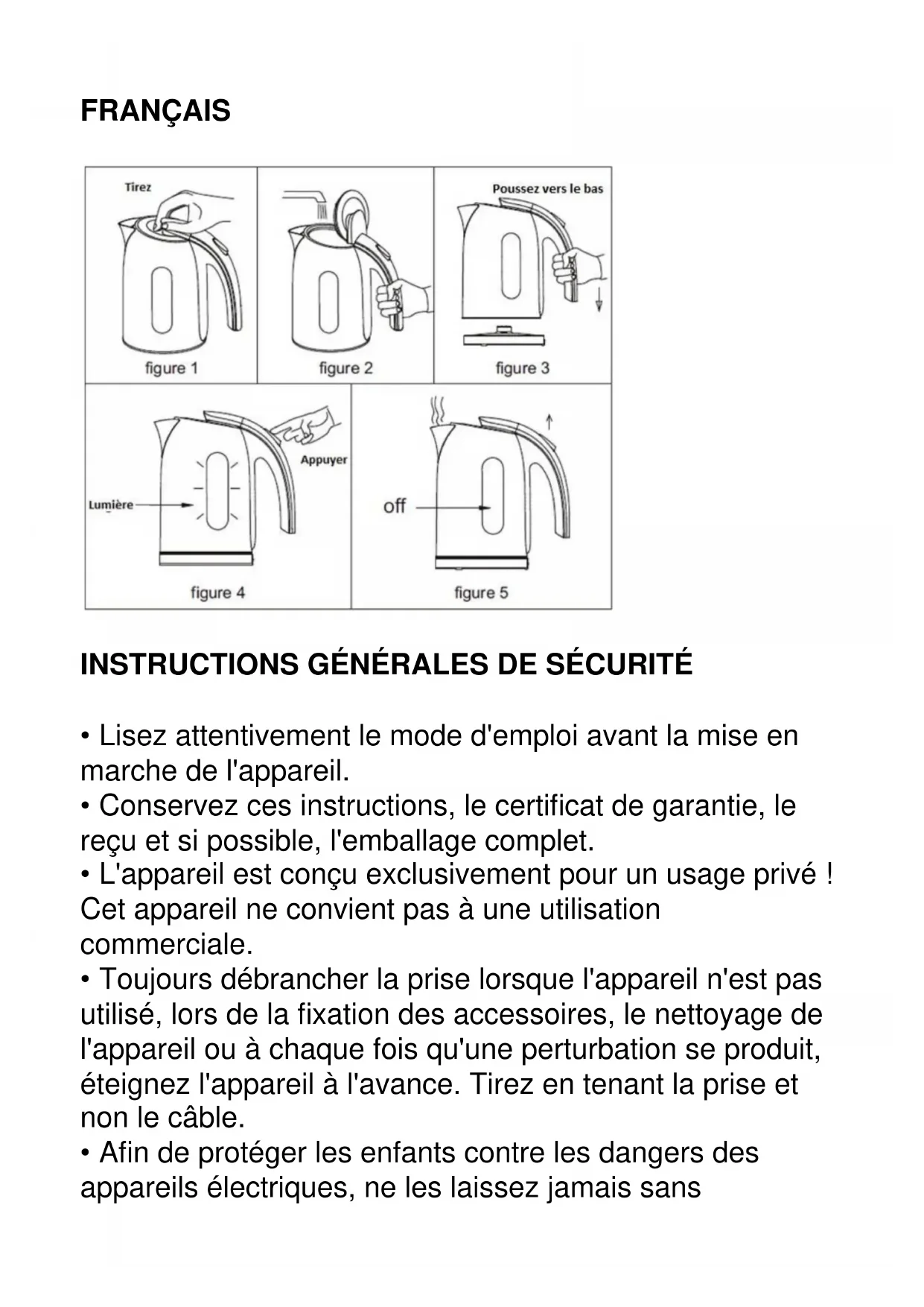 L'appareil n'est pas destiné à être mis en fonctionnement au moyen d'une minuterie extérieure ou par un système de commande à distance séparé CONSIGNES SPECIALES DE SECURITE POUR CET APPAREIL