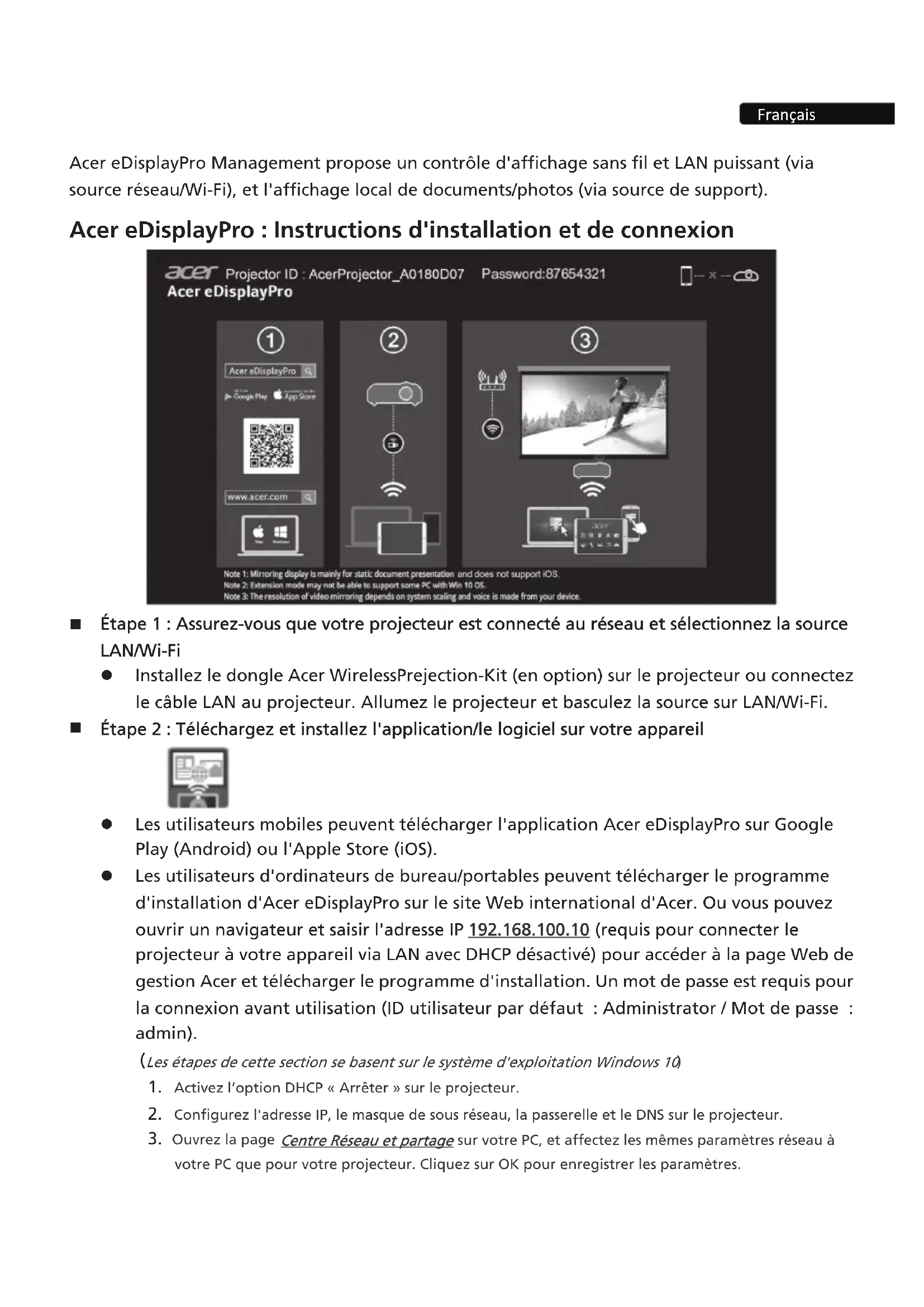 ode Français Acer eDisplayPro Management propose un contrôle d'affichage sans fil et LAN puissant (via source réseau/Wi-Fi), et l'affichage local de documents/photos (via source de support). Acer eDisplayPro : Instructions d'installation et de connexion