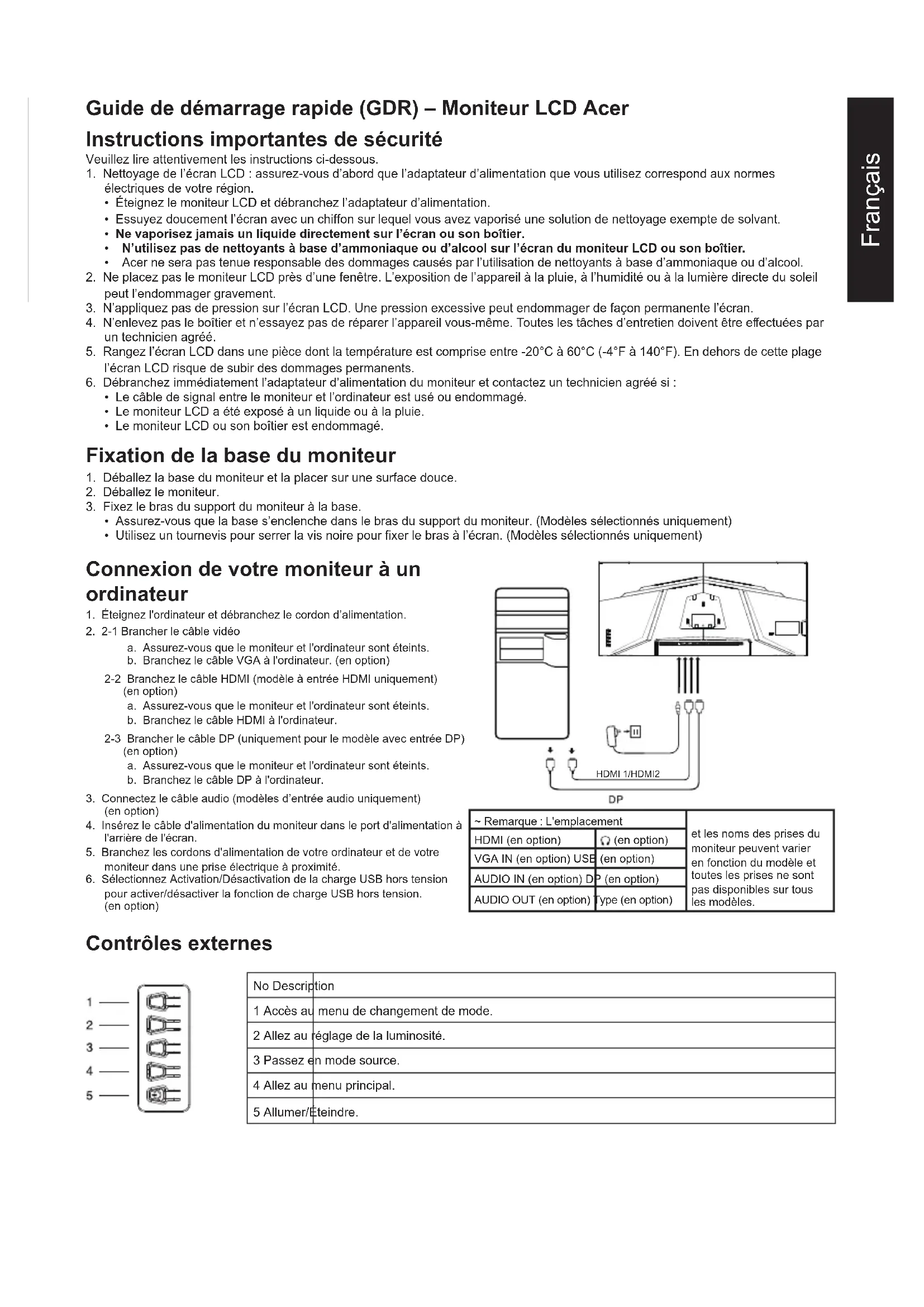pour activer/désactiver la fonction de charge USB hors tension. (en option) HDMI 1/HDMI2 ~ Remarque : L'emplacement et les noms des prises du moniteur peuvent varier en fonction du modèle et toutes les prises ne sont pas disponibles sur tous les modèles. HDMI (en option) (en option) VGA IN (en option) USB (en option) AUDIO IN (en option) DP (en option) AUDIO OUT (en option) Type (en option) Contrôles externes No Description 1 Accès au menu de changement de mode. 2 Allez au réglage de la luminosité. 3 Passez en mode source. 4 Allez au menu principal. 5 Allumer/Éteindre.Français Déclarations réglementaires et de sécurité Déclaration de la FCC Cet équipement a été contrôlé et déclaré conforme aux limites fixées pour un appareil numérique de classe B, en vertu de la section15 du règlement de la FCC. Ces limites sont conçues pour fournir une protection raisonnable contre les interférences nuisibles dans les installations résidentielles. Cet équipement génère, utilise et peut émettre de l'énergie radiofréquence et, s'il n'est pas installé et utilisé conformément aux instructions fournies, peut produire des interférences nuisibles aux communications radio. Cependant, rien ne garantit qu’aucune interférence ne se produise dans une installation particulière. Si cet équipement provoque des interférences indésirables avec les réceptions radio et TV (ce que vous pouvez déterminer en allumant et en éteignant l’appareil), nous vous conseillons vivement d’y remédier en prenant l’une des mesures suivantes :