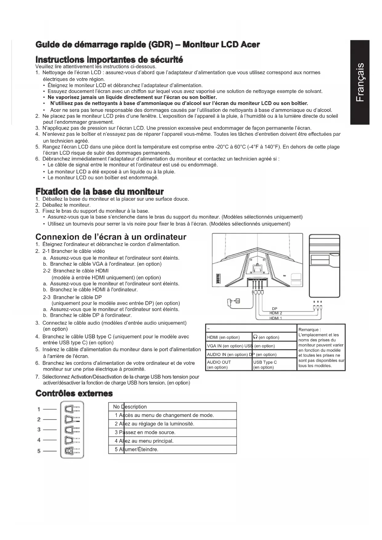 Remarque : L'emplacement et les noms des prises du moniteur peuvent varier en fonction du modèle et toutes les prises ne sont pas disponibles sur tous les modèles. HDMI (en option) (en option) VGA IN (en option) USB (en option) AUDIO IN (en option) DP (en option) AUDIO OUT (en option) USB Type C (en option) Contrôles externes No Description 1 Accès au menu de changement de mode. 2 Allez au réglage de la luminosité. 3 Passez en mode source. 4 Allez au menu principal. 5 Allumer/Éteindre.Français Déclarations réglementaires et de sécurité Déclaration de la FCC Cet équipement a été contrôlé et déclaré conforme aux limites fixées pour un appareil numérique de classe B, en vertu de la section 15 du règlement de la FCC. Ces limites sont conçues pour fournir une protection raisonnable contre les interférences nuisibles dans les installations résidentielles. Cet équipement génère, utilise et peut émettre de l'énergie radiofréquence et, s'il n'est pas installé et utilisé conformément aux instructions fournies, peut produire des interférences nuisibles aux communications radio. Cependant, rien ne garantit qu’aucune interférence ne se produise dans une installation particulière. Si cet équipement provoque des interférences indésirables avec les réceptions radio et TV (ce que vous pouvez déterminer en allumant et en éteignant l’appareil), nous vous conseillons vivement d’y remédier en prenant l’une des mesures suivantes :
