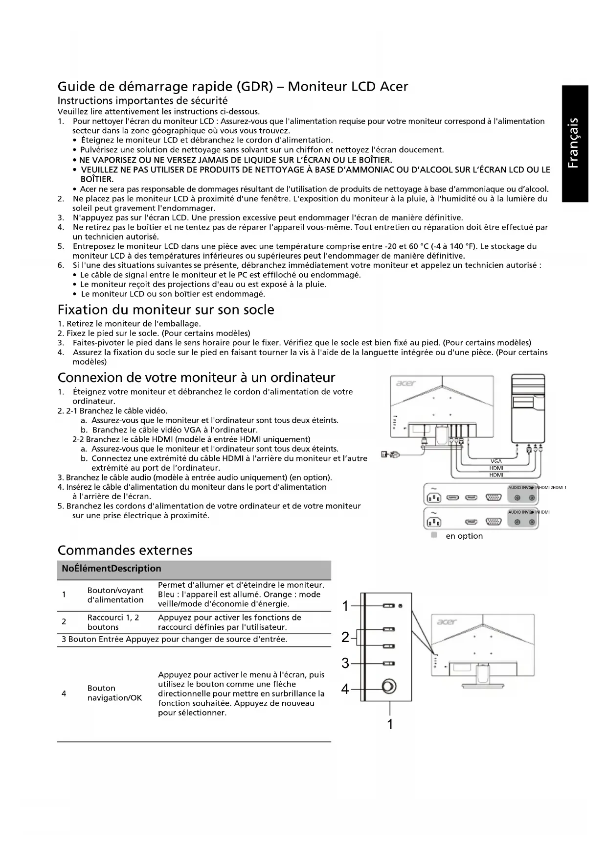 ordinateur.2. 2-1 Branchez le câble vidéo.a. Assurez-vous que le moniteur et l'ordinateur sont tous deux éteints.b. Branchez le câble vidéo VGA à l'ordinateur. 2-2 Branchez le câble HDMI (modèle à entrée HDMI uniquement)a. Assurez-vous que le moniteur et l'ordinateur sont tous deux éteints. b. Connectez une extrémité du câble HDMI à l’arrière du moniteur et l’autre extrémité au port de l’ordinateur.3. Branchez le câble audio (modèle à entrée audio uniquement) (en option).4. Insérez le câble d'alimentation du moniteur dans le port d'alimentation à l'arrière de l'écran.5. Branchez les cordons d'alimentation de votre ordinateur et de votre moniteur sur une prise électrique à proximité. Commandes externes No Élément Description
