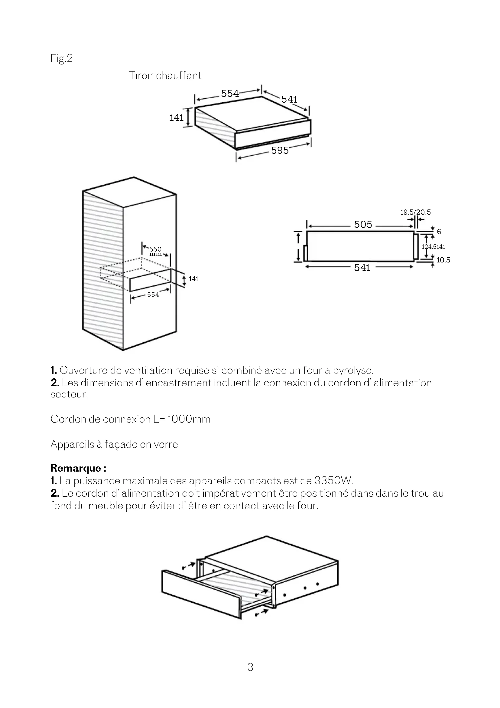 Fig.1-Fig.2 Le tiroir chauffant ne peut être installé qu’en combinaison avec les appareils indiqués comme appropriés par le fabricant. Le fabricant ne garantit pas l’usage sans problème si l’appareil est utilisé en combinaison avec des appareils autres que ceux indiqués par le fabricant comme étant appropriés. Lors de l’installation du tiroir chauffant en combinaison avec un autre appareil approprié, le tiroir chauffant doit être installé au-dessus d’une étagère intermédiaire xe dans le meuble. Vériez qu’elle puisse supporter le poids combiné du tiroir et de l’autre appareil. Comme l’appareil combiné est placé directement au-dessus du tiroir chauffant une fois qu’il est encastré, une étagère intermédiaire n’est pas requise entre les deux appareils. L’appareil doit être encastré en sorte que les contenus du tiroir ne puissent pas être visibles. Cela permet d’éviter des brûlures dues à des projections alimentaires très chaudes. Il doit y avoir sufsamment d’espace pour pouvoir ouvrir complètement le tiroir. Les dimensions d’encastrement pour le tiroir chauffant doivent être ajoutées aux dimensions d’encastrement pour l’appareil combiné an d’établir la taille de niche requise. Toutes les dimensions fournies dans cette notice sont indiquées en mm.