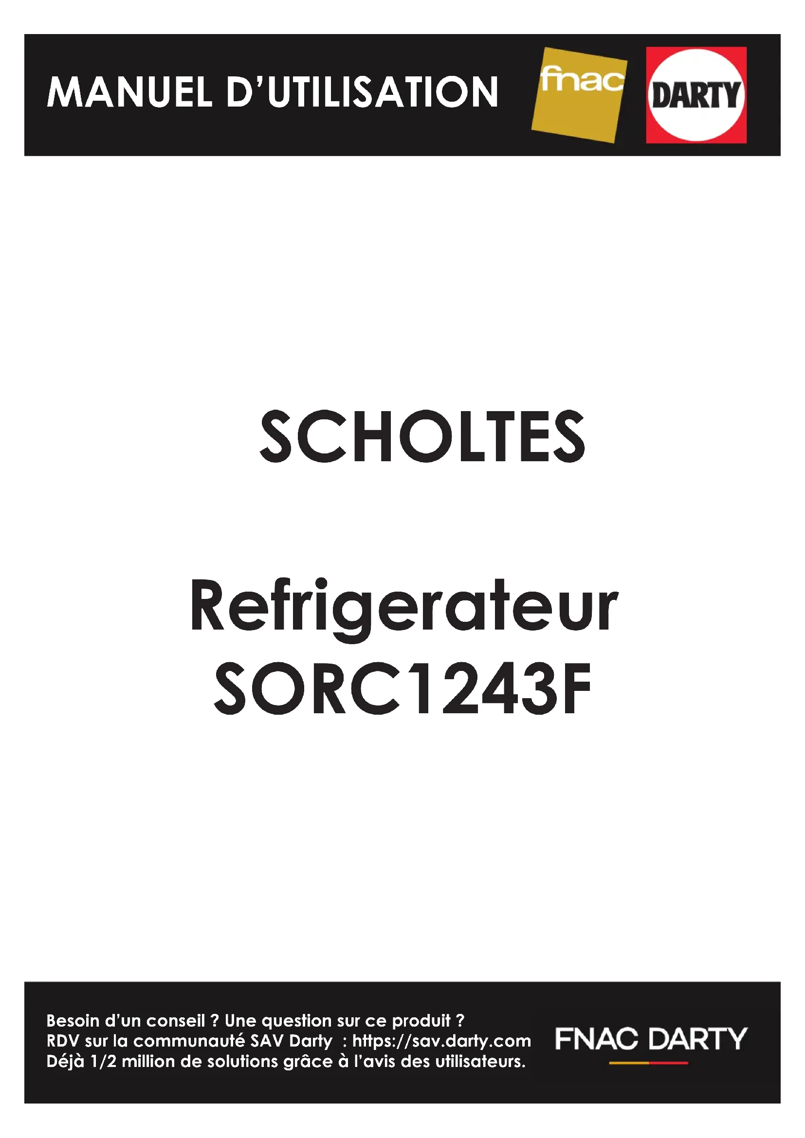 Besoin d’un conseil ? Une question sur ce produit ? RDV sur la communauté SAV Darty : https://sav.darty.com Déjà 1/2 million de solutions grâce à l’avis des utilisateurs. SCHOLTES Refrigerateur SORC1243F MANUEL D’UTILISATIONEncastrable Congélateur - Réfrigérateur Manuel d’utilisation Instructions de sécurité Built-in Fridge - Freezer User manual Safety instructionFR - 2 Merci d’avoir choisi ce produit. Cette notice d’utilisation contient des informations et des consignes de sécurité importantes concernant l’utilisation et l’entretien de votre appareil. Lire attentivement cette notice d’utilisation avant d’utiliser votre appareil et la conserver pour consultation ultérieure. Icône Type Signication AVERTISSEMENT Risque de blessures graves ou danger de mort RISQUE D’ÉLECTROCUTION Risque d’électrocution INCENDIE Avertissement : Risque d'incendie / matières inammables MISE EN GARDE Risque de blessures ou de dommages matériels IMPORTANT Utilisation correcte de l’appareilFR - 3 SOMMAIRE
