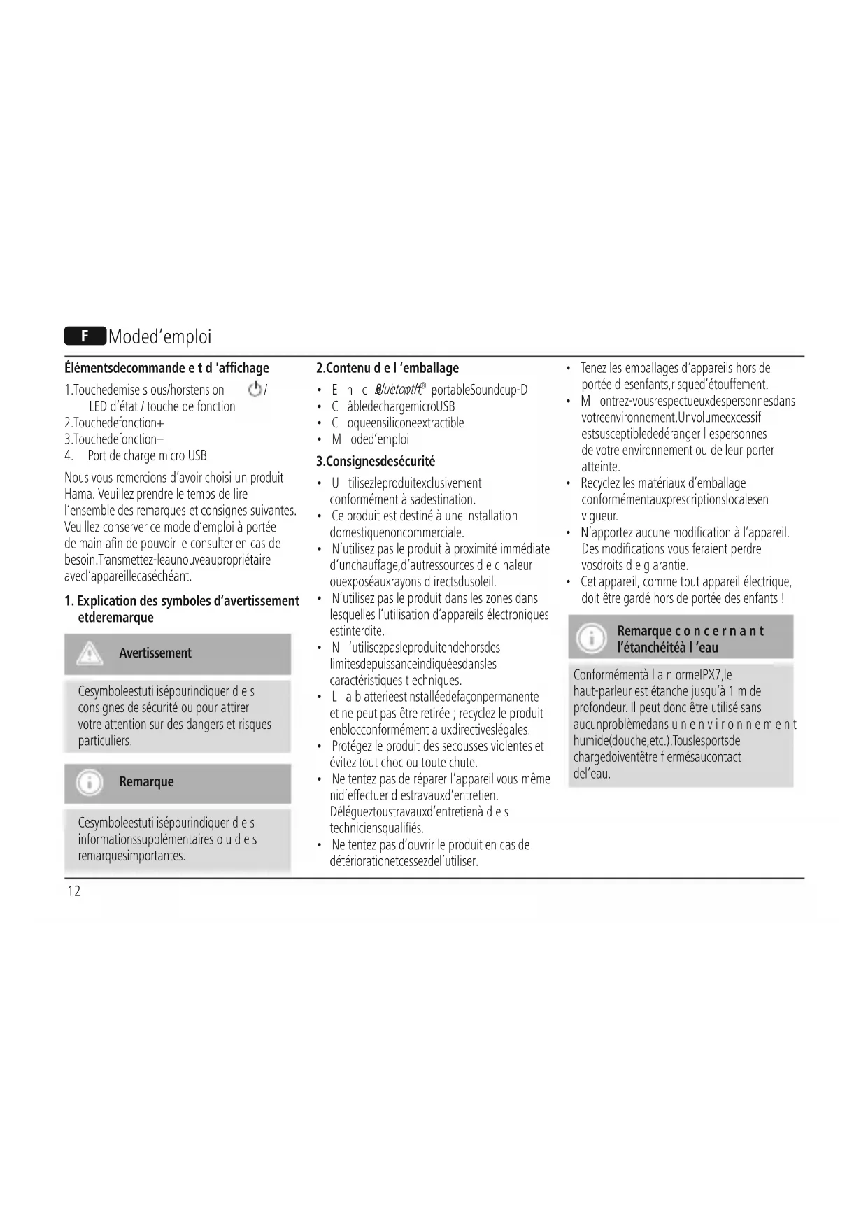 - Cet appareil, commetoutappareil électrique, doitêtregardé hors de portée des enfants ! Remarqueconcernant l’étanchéité àl’eau Conformément àlanorme IPX7, le haut-parleur estétanchejusqu’à 1mde profondeur. Il peut doncêtreutilisé sans aucun problème dansunenvironnement humide (douche, etc.). Tous les portsde charge doivent êtrefermés au contact de l’eau.13