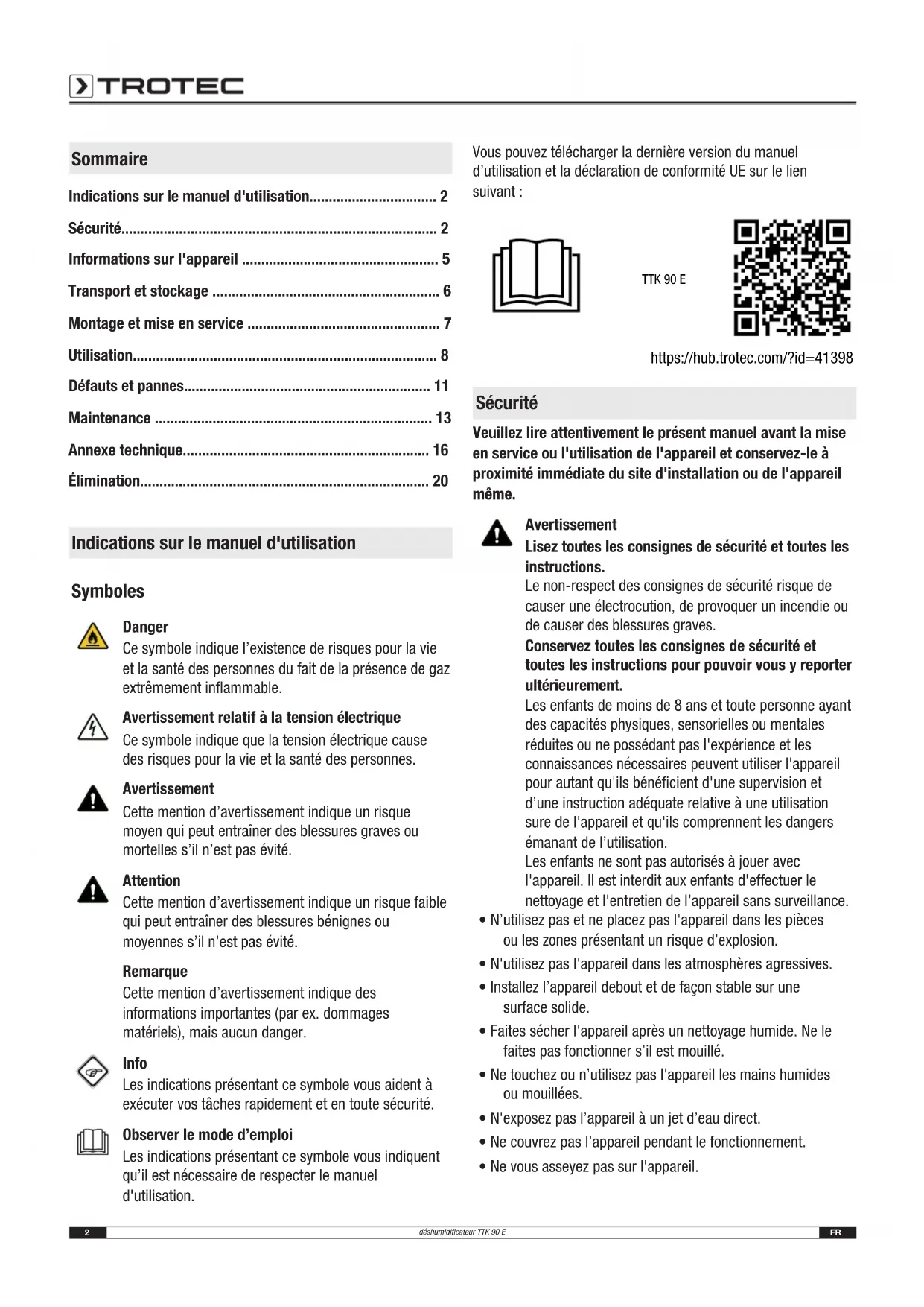 - Élimination Indications sur le manuel d'utilisation Symboles Danger Ce symbole indique l’existence de risques pour la vie et la santé des personnes du fait de la présence de gaz extrêmement inflammable. Avertissement relatif à la tension électrique Ce symbole indique que la tension électrique cause des risques pour la vie et la santé des personnes. Avertissement Cette mention d’avertissement indique un risque moyen qui peut entraîner des blessures graves ou mortelles s’il n’est pas évité. Attention Cette mention d’avertissement indique un risque faible qui peut entraîner des blessures bénignes ou moyennes s’il n’est pas évité. Remarque Cette mention d’avertissement indique des informations importantes (par ex. dommages matériels), mais aucun danger. Info Les indications présentant ce symbole vous aident à exécuter vos tâches rapidement et en toute sécurité. Observer le mode d’emploi Les indications présentant ce symbole vous indiquent qu’il est nécessaire de respecter le manuel d'utilisation. Vous pouvez télécharger la dernière version du manuel d’utilisation et la déclaration de conformité UE sur le lien suivant: TTK 90 E https://hub.trotec.com/?id=41398 Sécurité Veuillez lire attentivement le présent manuel avant la mise en service ou l'utilisation de l'appareil et conservez-le à proximité immédiate du site d'installation ou de l'appareil même. Avertissement Lisez toutes les consignes de sécurité et toutes les instructions. Le non-respect des consignes de sécurité risque de causer une électrocution, de provoquer un incendie ou de causer des blessures graves. Conservez toutes les consignes de sécurité et toutes les instructions pour pouvoir vous y reporter ultérieurement. Les enfants de moins de 8 ans et toute personne ayant des capacités physiques, sensorielles ou mentales réduites ou ne possédant pas l'expérience et les connaissances nécessaires peuvent utiliser l'appareil pour autant qu'ils bénéficient d'une supervision et d’une instruction adéquate relative à une utilisation sure de l'appareil et qu'ils comprennent les dangers émanant de l’utilisation. Les enfants ne sont pas autorisés à jouer avec l'appareil. Il est interdit aux enfants d'effectuer le nettoyage et l'entretien de l’appareil sans surveillance. p. 20