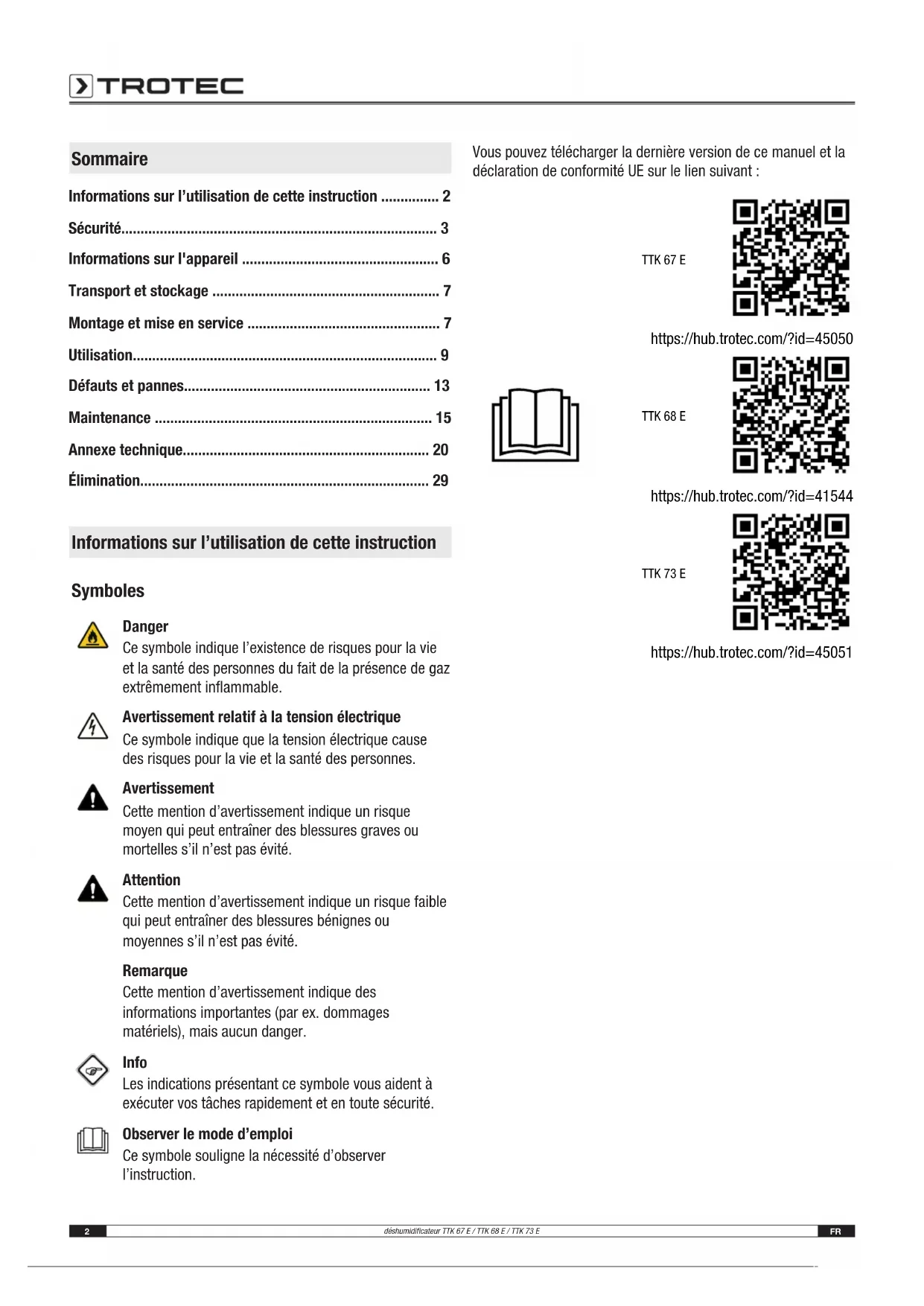 - Élimination Informations sur l’utilisation de cette instruction Symboles Danger Ce symbole indique l’existence de risques pour la vie et la santé des personnes du fait de la présence de gaz extrêmement inflammable. Avertissement relatif à la tension électrique Ce symbole indique que la tension électrique cause des risques pour la vie et la santé des personnes. Avertissement Cette mention d’avertissement indique un risque moyen qui peut entraîner des blessures graves ou mortelles s’il n’est pas évité. Attention Cette mention d’avertissement indique un risque faible qui peut entraîner des blessures bénignes ou moyennes s’il n’est pas évité. Remarque Cette mention d’avertissement indique des informations importantes (par ex. dommages matériels), mais aucun danger. Info Les indications présentant ce symbole vous aident à exécuter vos tâches rapidement et en toute sécurité. Observer le mode d’emploi Ce symbole souligne la nécessité d’observer l’instruction. Vous pouvez télécharger la dernière version de ce manuel et la déclaration de conformitéUE sur le lien suivant: TTK 67 E https://hub.trotec.com/?id=45050 TTK 68 E https://hub.trotec.com/?id=41544 TTK 73 E https://hub.trotec.com/?id=45051FR 3 déshumidificateur TTK 67 E / TTK 68 E / TTK 73 E Sécurité Veuillez lire attentivement le présent manuel avant la mise en service ou l'utilisation de l'appareil et conservez-le à proximité immédiate du site d'installation ou de l'appareil même. Avertissement Lisez toutes les consignes de sécurité et toutes les instructions. Le non-respect des consignes de sécurité risque de causer une électrocution, de provoquer un incendie ou de causer des blessures graves. Conservez toutes les consignes de sécurité et toutes les instructions pour pouvoir vous y reporter ultérieurement. Les enfants de moins de 8 ans et toute personne ayant des capacités physiques, sensorielles ou mentales réduites ou ne possédant pas l'expérience et les connaissances nécessaires peuvent utiliser l'appareil pour autant qu'ils bénéficient d'une supervision et d’une instruction adéquate relative à une utilisation sure de l'appareil et qu'ils comprennent les dangers émanant de l’utilisation. Les enfants ne sont pas autorisés à jouer avec l'appareil. Il est interdit aux enfants d'effectuer le nettoyage et l'entretien de l’appareil sans surveillance. p. 29