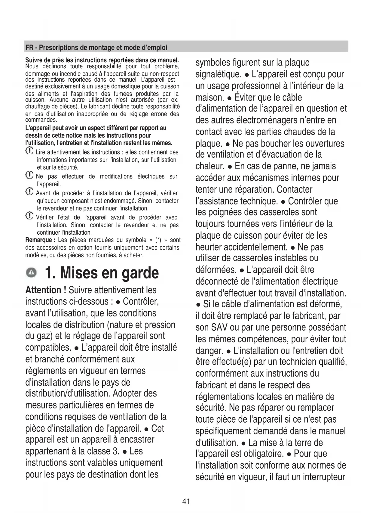 Attention ! Suivre attentivement les instructions ci-dessous : ● Contrôler, avant l’utilisation, que les conditions locales de distribution (nature et pression du gaz) et le réglage de l’appareil sont compatibles. ● L’appareil doit être installé et branché conformément aux règlements en vigueur en termes d’installation dans le pays de distribution/d’utilisation. Adopter des mesures particulières en termes de conditions requises de ventilation de la pièce d’installation de l’appareil. ● Cet appareil est un appareil à encastrer appartenant à la classe 3. ● Les instructions sont valables uniquement pour les pays de destination dont les symboles figurent sur la plaque signalétique. ● L’appareil est conçu pour un usage professionnel à l’intérieur de la maison. ● Éviter que le câble d’alimentation de l’appareil en question et des autres électroménagers n’entre en contact avec les parties chaudes de la plaque. ● Ne pas boucher les ouvertures de ventilation et d’évacuation de la chaleur. ● En cas de panne, ne jamais accéder aux mécanismes internes pour tenter une réparation. Contacter l’assistance technique. ● Contrôler que les poignées des casseroles sont toujours tournées vers l’intérieur de la plaque de cuisson pour éviter de les heurter accidentellement. ● Ne pas utiliser de casseroles instables ou déformées. ● L'appareil doit être déconnecté de l'alimentation électrique avant d'effectuer tout travail d'installation. ● Si le câble d’alimentation est déformé, il doit être remplacé par le fabricant, par son SAV ou par une personne possédant les mêmes compétences, pour éviter tout danger. ● L'installation ou l'entretien doit être effectué(e) par un technicien qualifié, conformément aux instructions du fabricant et dans le respect des réglementations locales en matière de sécurité. Ne pas réparer ou remplacer toute pièce de l'appareil si ce n'est pas spécifiquement demandé dans le manuel d'utilisation. ● La mise à la terre de l'appareil est obligatoire. ● Pour que l'installation soit conforme aux normes de sécurité en vigueur, il faut un interrupteur42 omnipolaire conforme aux normes garantissant la déconnexion complète du circuit électrique dans les conditions de la catégorie de surtension III, conformément aux règles d'installation. ● Ne pas utiliser de prises multiples ou des rallonges. ● Une fois l'installation terminée, les composants électriques ne devront plus être accessibles par l'utilisateur. ● L'équipement et les parties accessibles deviennent très chauds pendant l'utilisation. Faire attention à ne pas toucher les éléments chauffants. ● Faire attention à ce que les enfants ne jouent pas avec l'appareil ; garder les enfants à distance et les surveiller, parce que les parties accessibles peuvent devenir très chaudes pendant l'utilisation. ● Pendant et après l'utilisation, ne pas toucher les éléments chauffants de l'appareil. ● Éviter le contact avec des chiffons ou autres matériaux inflammables jusqu'à ce que tous les composants de l'appareil ne soient suffisamment refroidis. ● Ne pas placer de matériaux inflammables sur l'appareil ou à proximité. ● Les graisses et les huiles chaudes peuvent facilement prendre feu. Surveiller la cuisson des aliments riches en graisse et huile. ● Si la surface est fêlée, éteindre l'appareil pour éviter la possibilité de décharge électrique. ● L'appareil n'est pas destiné à être mis en fonction au moyen d'une minuterie externe ou bien d'un système de commande à distance séparé. ● Le processus de cuisson doit être surveillé. ● Ne JAMAIS essayer d'éteindre les flammes avec de l'eau. Au lieu de cela, éteindre l'appareil et étouffer les flammes, par exemple avec un couvercle ou une couverture anti-feu. Risque d'incendie : ne pas placer d'objets sur les surfaces de cuisson. ● Ne pas utiliser de nettoyeurs à vapeur. ● Avant de raccorder le modèle au circuit électrique : contrôler la plaque signalétique (sur le fond de l'appareil) pour s'assurer que la tension et la puissance correspondent à celles du circuit et que la prise de branchement soit adaptée. En cas de doute, appeler un électricien qualifié. Important : ● Après utilisation, éteindre le plan de cuisson à travers son dispositif de commande. ● Éviter de renverser du liquide, réduire l'apport de chaleur. ● Ne pas laisser les éléments chauffants allumés avec des casseroles et des poêles vides ou sans récipients.