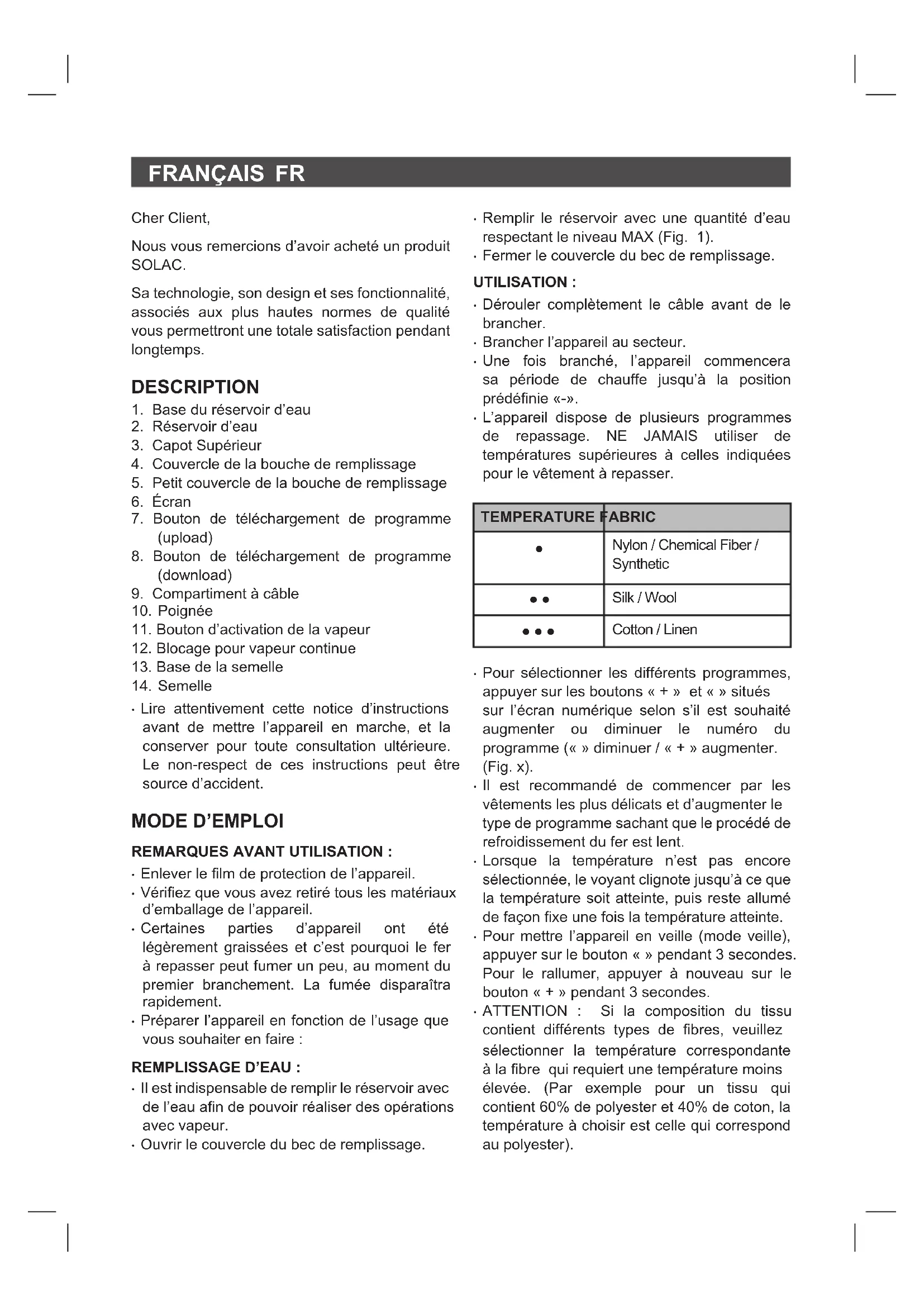 - L’appareil dispose de plusieurs programmes de repassage. NE JAMAIS utiliser de températures supérieures à celles indiquées pour le vêtement à repasser.