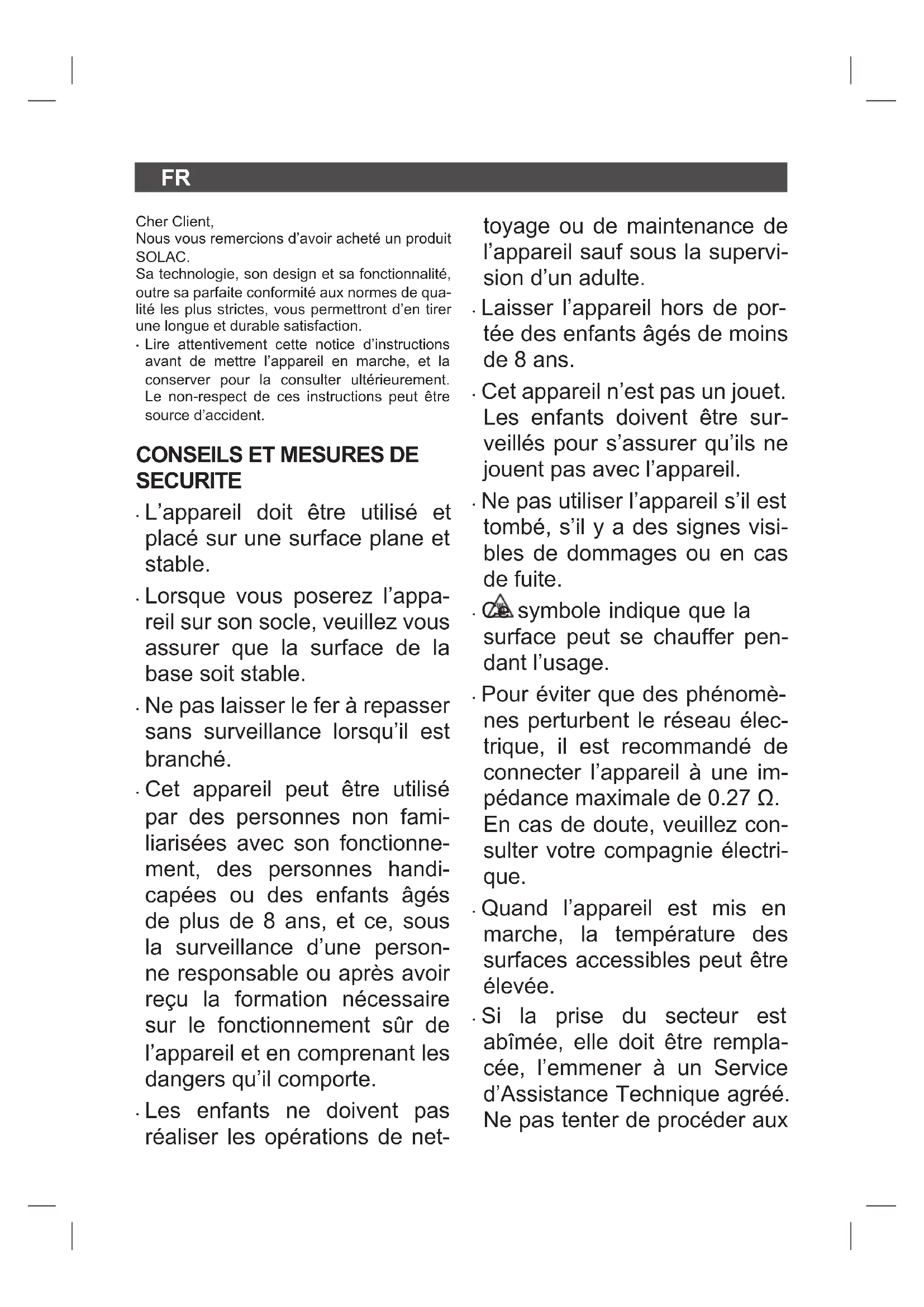 TECHNIQUE Ce produit est reconnu et protégé par la garantie établie conformément à la législation en vigueur. Pour faire valoir vos droits ou intérêts, vous de- vrez vous adresser à l’un de nos services d’as- sistance technique agréés. Pour savoir lequel est le plus proche, vous pou- vez accéder au lien suivant : http://solac.com Vous pouvez aussi nous contacter pour toute information. Vous pouvez télécharger ce manuel d’instruc- tions et ses mises à jour sur http://solac.com