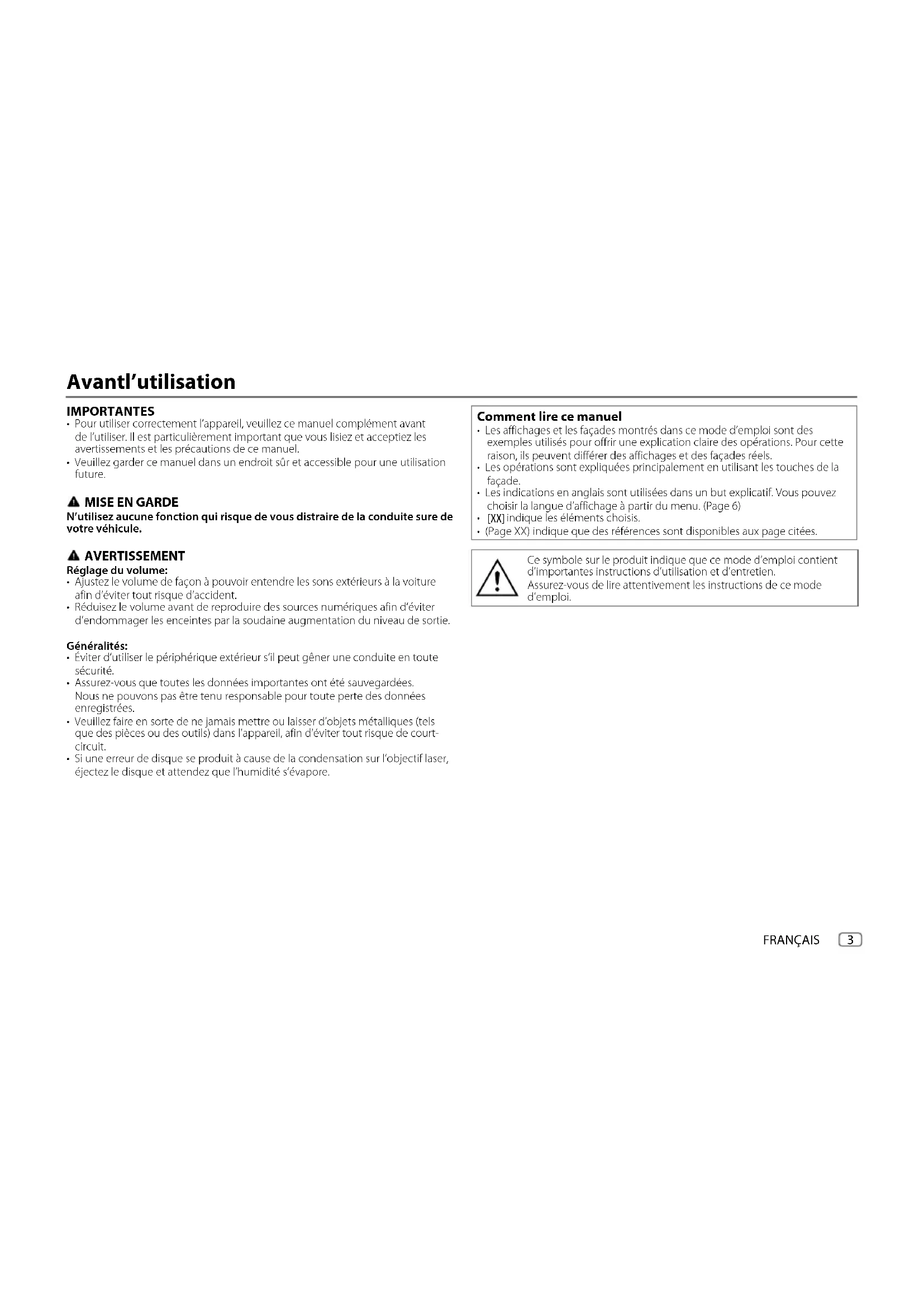 - Pour utiliser correctement l’appareil, veuillez ce manuel complément avant de l’utiliser. Il est particulièrement important que vous lisiez et acceptiez les avertissements et les précautions de ce manuel.