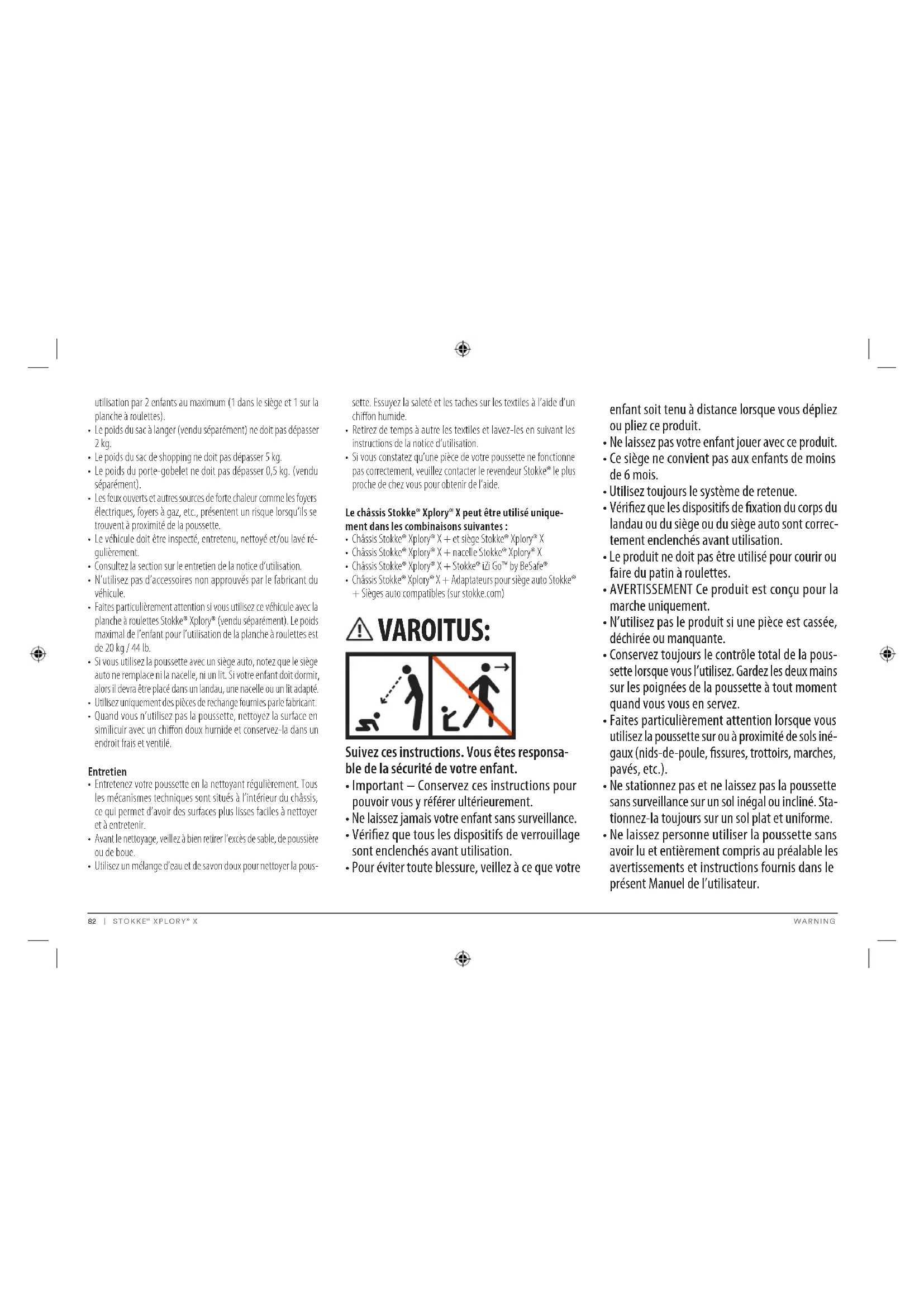 Châssis Stokke® Xplory® X + Adaptateurs pour siège auto Stokke® + Sièges auto compatibles (sur stokke.com) VAROITUS: Suivez ces instructions. Vous êtes responsa- ble de la sécurité de votre enfant.