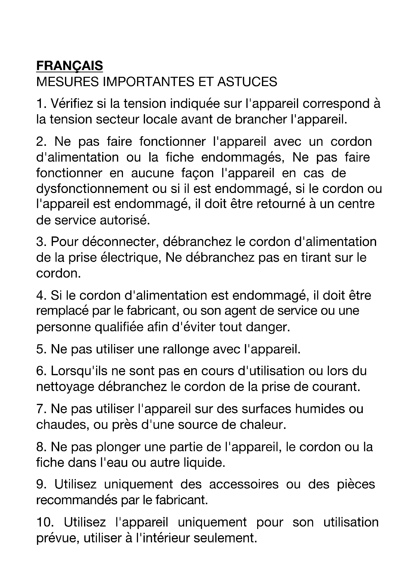 10. Utilisez l'appareil uniquement pour son utilisation