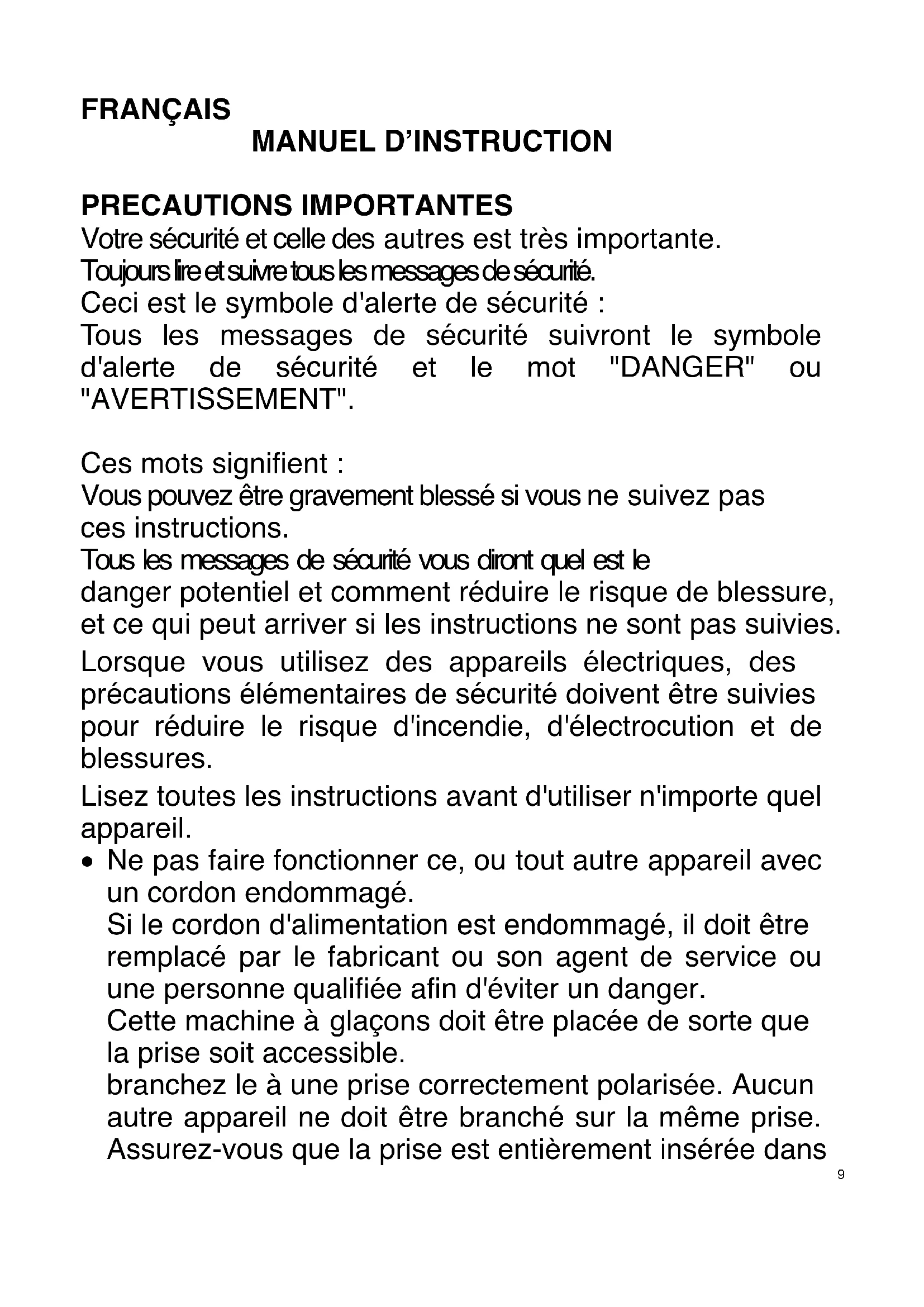 - Ne pas faire fonctionner ce, ou tout autre appareil avec un cordon endommagé. Si le cordon d'alimentation est endommagé, il doit être remplacé par le fabricant ou son agent de service ou une personne qualifiée afin d'éviter un danger. Cette machine à glaçons doit être placée de sorte que la prise soit accessible. branchez le à une prise correctement polarisée. Aucun autre appareil ne doit être branché sur la même prise. Assurez-vous que la prise est entièrement insérée dans10 le réceptacle.
