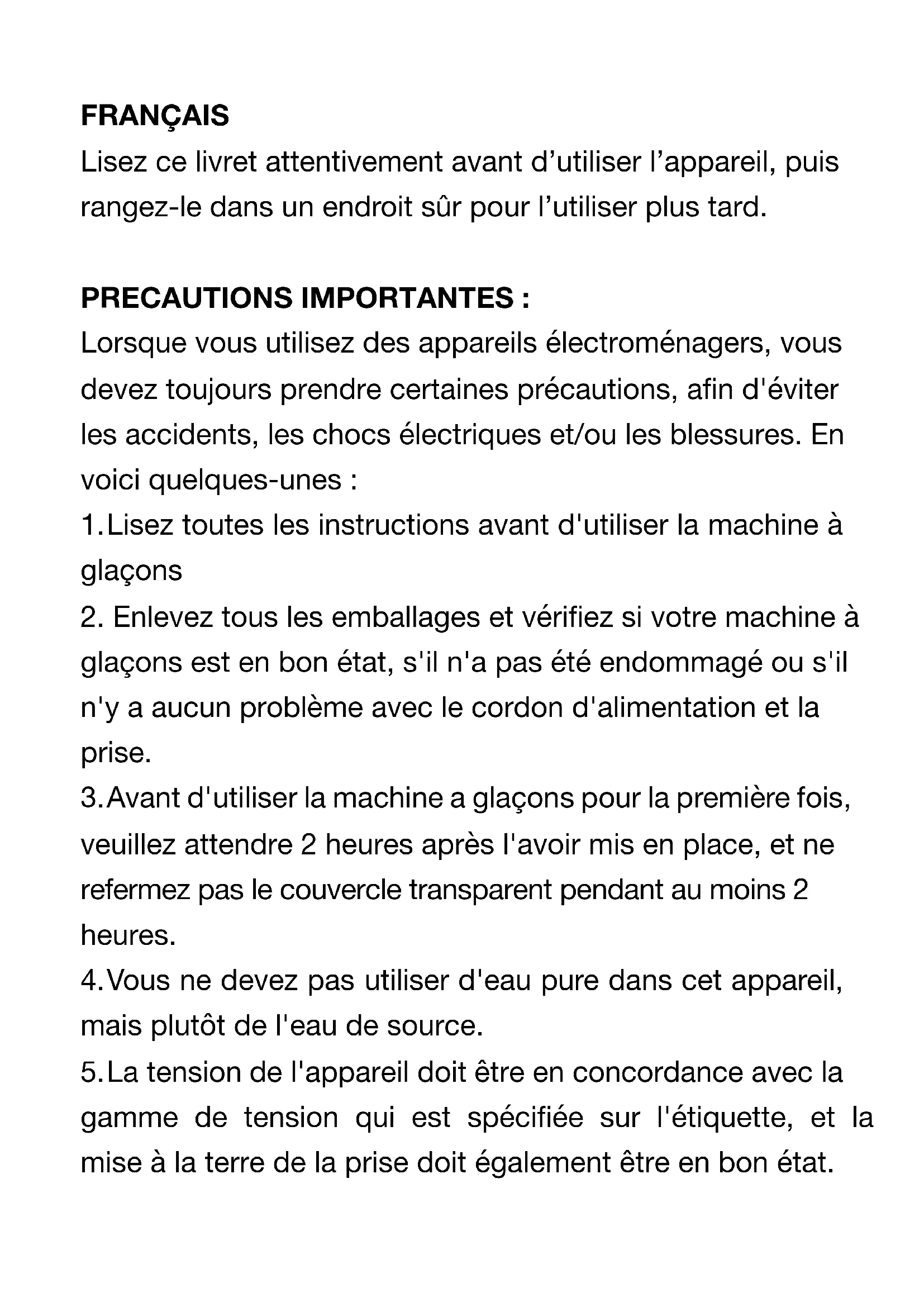 - Enlevez tous les emballages et vérifiez si votre machine à glaçons est en bon état, s'il n'a pas été endommagé ou s'il n'y a aucune problème avec le cordon d'alimentation et la prise.