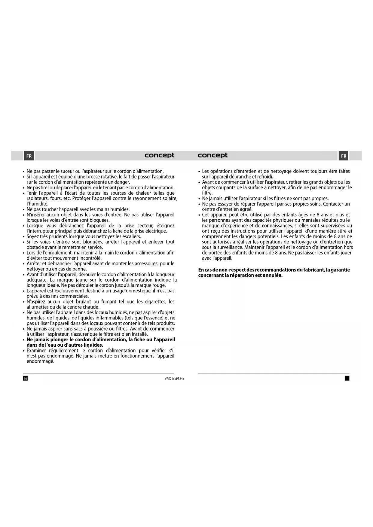 - Cet appareil peut être utilisé par des enfants âgés de 8 ans et plus et les personnes ayant des capacités physiques ou mentales réduites ou le manque d’expérience et de connaissances, si elles sont supervisées ou ont reçu des instructions pour utiliser l’appareil d’une manière sûre et comprennent les dangers potentiels. Les enfants de moins de 8 ans ne sont autorisés à réaliser les opérations de nettoyage ou d’entretien que sous la surveillance. Maintenir l’appareil et le cordon d’alimentation hors de portée des enfants de moins de 8 ans. Ne pas laisser les enfants jouer avec l’appareil. En cas de non-respect des recommandations du fabricant, la garantie concernant la réparation est annulée.62 63 FRFR VP524x VP524x