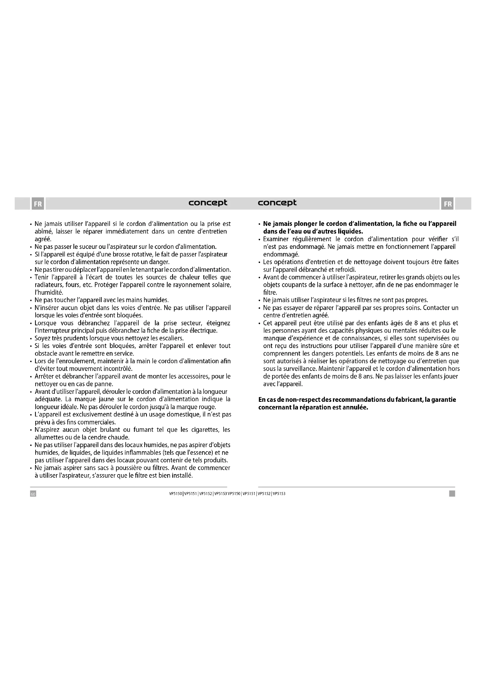 VP5150 | VP5151 | VP5152 | VP5153 MERCI Nous vous remercions d’avoir acheté le produit de la marque Concept et nous espérons qu’il vous apportera votre entière satisfaction pendant son utilisation. Lire attentivement le manuel d’emploi avant la première utilisation et le conserver. Faire prendre connaissance du manuel d’emploi par les autres personnes pouvant manipuler le produit. Caractéristiques techniques Tension 220–240 V ~ 50-60Hz Puissance 800 W Niveau de puissance acoustique ≤78 dB PRÉCAUTIONS PARTICULIÈRES DE SÉCURITÉ