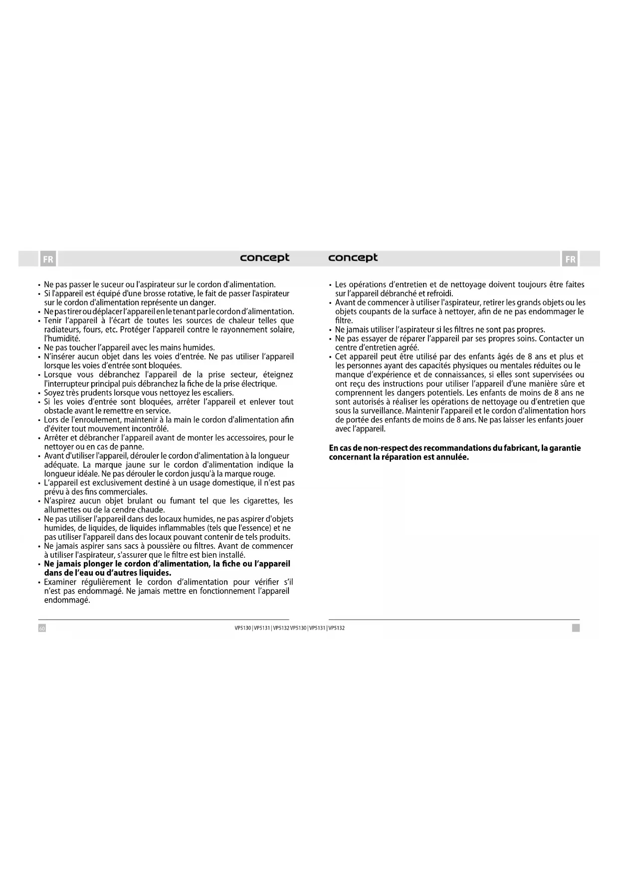 - Cet appareil peut être utilisé par des enfants âgés de 8 ans et plus et les personnes ayant des capacités physiques ou mentales réduites ou le manque d’expérience et de connaissances, si elles sont supervisées ou ont reçu des instructions pour utiliser l’appareil d’une manière sûre et comprennent les dangers potentiels. Les enfants de moins de 8 ans ne sont autorisés à réaliser les opérations de nettoyage ou d’entretien que sous la surveillance. Maintenir l’appareil et le cordon d’alimentation hors de portée des enfants de moins de 8 ans. Ne pas laisser les enfants jouer avec l’appareil. En cas de non-respect des recommandations du fabricant, la garantie concernant la réparation est annulée.62 63 FRFR VP5130 | VP5131 | VP5132 VP5130 | VP5131 | VP5132