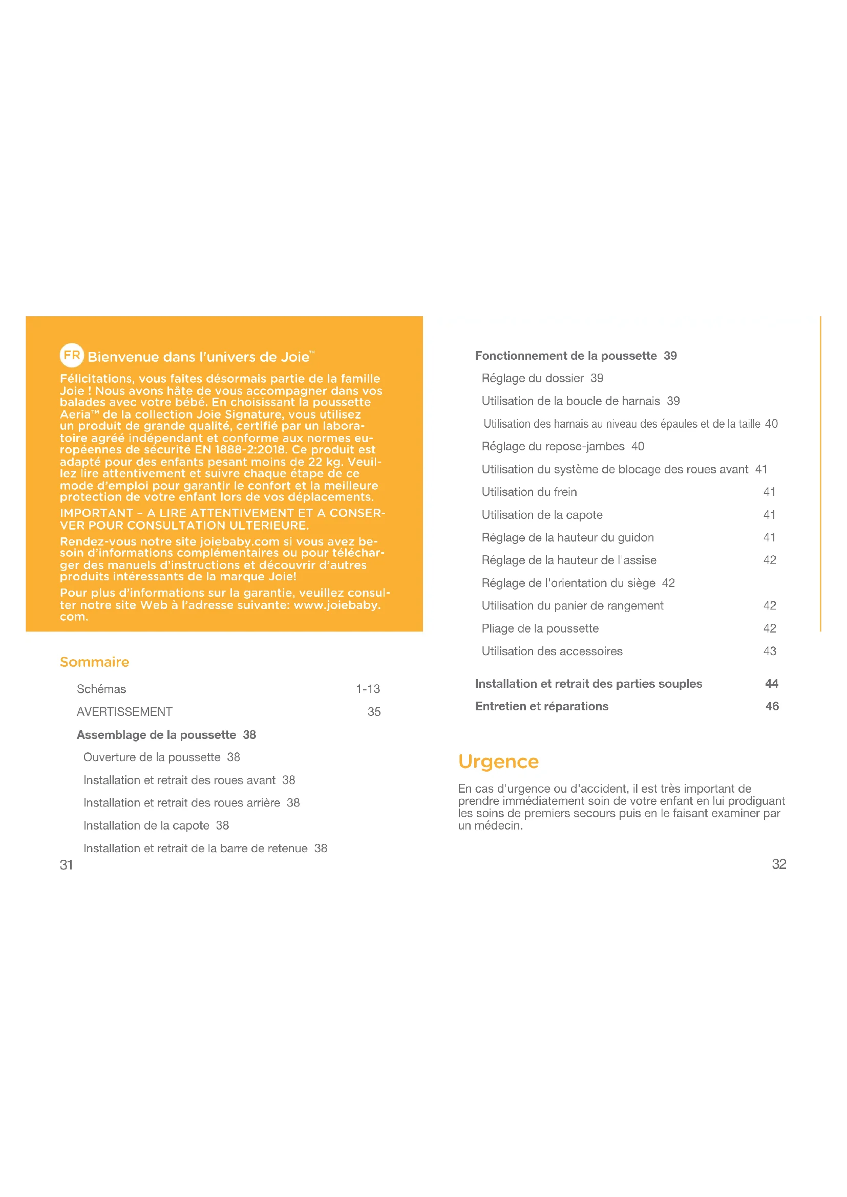 Félicitations, vous faites désormais partie de la famille Joie ! Nous avons hâte de vous accompagner dans vos balades avec votre bébé. En choisissant la poussette Aeria™ de la collection Joie Signature, vous utilisez un produit de grande qualité, certifié par un labora- toire agréé indépendant et conforme aux normes eu- ropéennes de sécurité EN 1888-2:2018. Ce produit est adapté pour des enfants pesant moins de 22 kg. Veuil- lez lire attentivement et suivre chaque étape de ce mode d’emploi pour garantir le confort et la meilleure protection de votre enfant lors de vos déplacements. IMPORTANT – A LIRE ATTENTIVEMENT ET A CONSER- VER POUR CONSULTATION ULTERIEURE. Rendez-vous notre site joiebaby.com si vous avez be- soin d’informations complémentaires ou pour téléchar- ger des manuels d’instructions et découvrir d’autres produits intéressants de la marque Joie! Pour plus d’informations sur la garantie, veuillez consul- ter notre site Web à l’adresse suivante: www.joiebaby. com. Sommaire Schémas 1-13 AVERTISSEMENT 35 Assemblage de la poussette 38 Ouverture de la poussette 38 Installation et retrait des roues avant 38 Installation et retrait des roues arrière 38 Installation de la capote 38 Installation et retrait de la barre de retenue 38 Fonctionnement de la poussette 39 Réglage du dossier 39 Utilisation de la boucle de harnais 39 Utilisation des harnais au niveau des épaules et de la taille