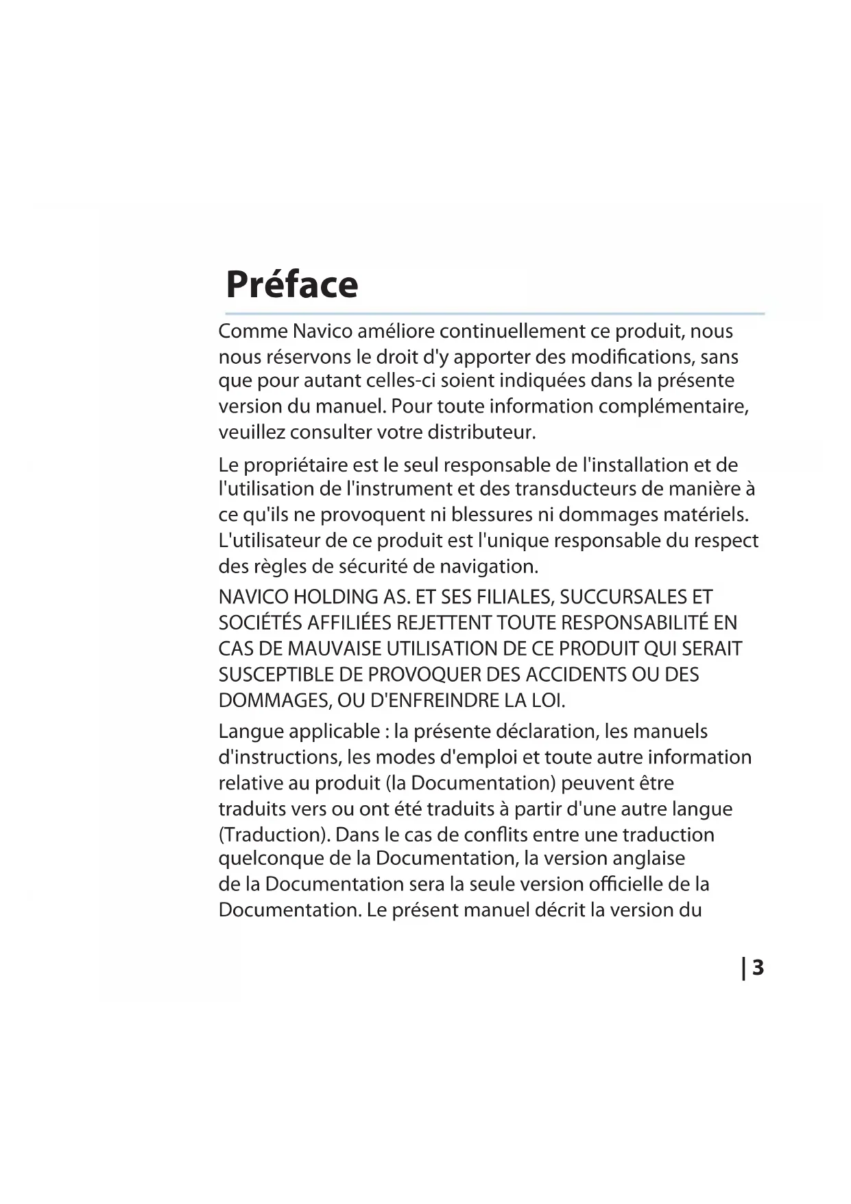 www.lowrance.com/fr-fr/ FRANÇAIS FishHunter3D/PRO Manuel d'utilisation| 3 Préface Comme Navico améliore continuellement ce produit, nous nous réservons le droit d'y apporter des modications, sans que pour autant celles-ci soient indiquées dans la présente version du manuel. Pour toute information complémentaire, veuillez consulter votre distributeur. Le propriétaire est le seul responsable de l'installation et de l'utilisation de l'instrument et des transducteurs de manière à ce qu'ils ne provoquent ni blessures ni dommages matériels. L'utilisateur de ce produit est l'unique responsable du respect des règles de sécurité de navigation. NAVICO HOLDING AS. ET SES FILIALES, SUCCURSALES ET SOCIÉTÉS AFFILIÉES REJETTENT TOUTE RESPONSABILITÉ EN CAS DE MAUVAISE UTILISATION DE CE PRODUIT QUI SERAIT SUSCEPTIBLE DE PROVOQUER DES ACCIDENTS OU DES DOMMAGES, OU D'ENFREINDRE LA LOI. Langue applicable: la présente déclaration, les manuels d'instructions, les modes d'emploi et toute autre information relative au produit (la Documentation) peuvent être traduits vers ou ont été traduits à partir d'une autre langue (Traduction). Dans le cas de conits entre une traduction quelconque de la Documentation, la version anglaise de la Documentation sera la seule version ocielle de la Documentation. Le présent manuel décrit la version du4 | produit en cours au moment où ce document a été imprimé. Navico Holding AS. et ses liales, succursales et sociétés aliées se réservent le droit de modier les spécications sans préavis. Copyright Copyright © 2019 Navico Holding AS. Garantie Le contrat de garantie est un document fourni indépendamment de cette notice. Pour toute demande relative à la garantie, veuillez consulter le site Web concernant votre appareil: www.lowrance.fr Déclarations et conformité Cet équipement est prévu pour être utilisé dans les eaux internationales, les eaux intérieures et dans les zones maritimes côtières administrées par les États-Unis, les pays de l'Union européenne et l'Espace économique européen. Déclaration de conformité Cet équipement est conforme: