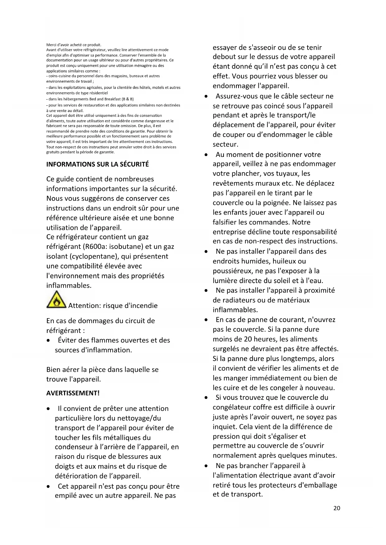 Ce guide contient de nombreuses informations importantes sur la sécurité. Nous vous suggérons de conserver ces instructions dans un endroit sûr pour une référence ultérieure aisée et une bonne utilisation de l’appareil. Ce réfrigérateur contient un gaz réfrigérant (R600a: isobutane) et un gaz isolant (cyclopentane), qui présentent une compatibilité élevée avec l'environnement mais des propriétés inflammables. Attention: risque d'incendie En cas de dommages du circuit de réfrigérant :