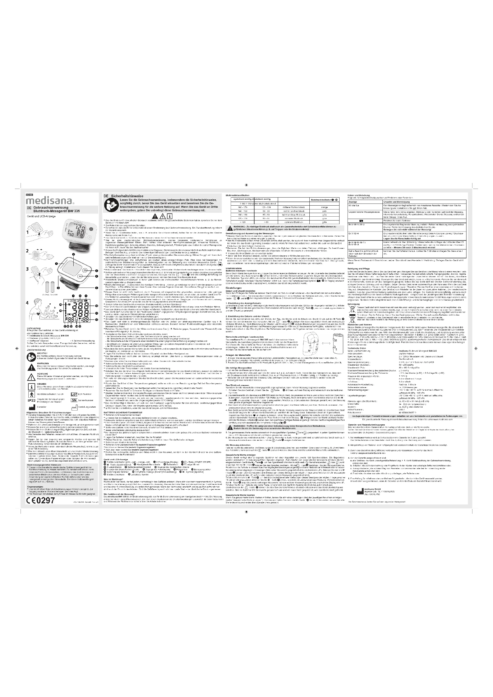 Erreurs et comment y remédierLes messages suivants sur l'écran indiquent des problèmes ou des erreurs :Si vous ne pouvez résoudre un problème, contactez le fabricant. Ne démontez pas vous-même l’appareil.Nettoyage et entretien Retirez les piles avant de nettoyer l’appareil. Nettoyez l’appareil et le brassard avec un chion doux humidié avec une eau légèrement savonneuse. N’utilisez en aucun cas des détergents agressifs, de l’alcool, du naphte, des diluants ou de l’essence, etc. Ne plongez pas l’appareil, ni une de ses parties, dans l’eau. Veillez à ce qu’aucun liquide ne s’inltre à l’intérieur de l’appareil. Ne réutilisez l'appareil que lorsqu'il est parfaitement sec. Le brassard ne doit être goné qu'après avoir été placé autour du poignet. N’exposez pas l’appareil aux rayons directs du soleil, protégez-le des saletés et de l’humidité. N’exposez pas l’appareil à une chaleur ou un froid extrêmes. Lorsque vous n’utilisez pas l’appareil, conservez-le dans l'emballage d'origine. Rangez l’appareil dans un endroit propre et sec. Contrôle métrologique : L'appareil est étalonné par le fabricant pour une période de deux ans. En cas d'utilisation commerciale, le contrôle métrologique doit être eectué au moins tous les deux ans. L'inspection est payante et peut être eectuée par une autorité compétente ou par des services de maintenance agréés – conformément à l'« Ordonnance relative aux fabricants de dispositifs médicaux ». S'il est utilisé selon les instructions, l'appareil fonctionne en toute sécurité pendant au moins 10 000 mesures ou trois ans. L'intégrité de la manchette est garantie même après 1 000 cycles d'ouverture et de fermeture.Élimination Cet appareil ne doit pas être placé avec les ordures ménagères. Chaque consommateur doit ramener les appareils électriques ou électroniques, qu’ils contiennent des substances nocives ou non, à un point de collecte de sa commune ou dans le commerce an de permettre leur élimination écologique. Retirez les piles avant de jeter l’appareil. Ne mettez pas les piles usagées à la poubelle, placez-les avec les déchets spéciaux ou déposezles dans un point de collecte des piles usagées dans les commerces spécialisés. Pour plus de renseignements sur l’élimination des déchets, veuillez vous adresser aux services de votre commune ou bien à votre revendeur. Directives / NormesCe tensiomètre est conforme aux normes européennes pour la mesure non invasive de la tension. Il est certié selon des directives européennes et doté du sigle CE (sigle de conformité) « CE 0297 ». Il répond aux exigences de la directive 93/42/CE du Conseil européen du 14 juin 1993 relative aux dispositifs médicaux. La conception et la fabrication ont été réalisées dans le respect des normes européennes suivantes : IEC 60601-1 Edition 3.1 2012-08/EN 60601-1:2006/A11: 2013, IEC60601-1-2:2014/EN 60601-1-2:2015, IEC80601-2-30:2009+AMD1:2013/EN 80601-2-30:2010/A1:2015, EN 1060-1: 1995 + A2: 2009, EN 1060-3: 1997 + A2: 2009; ISO81060-2:2013. Compatibilité électromagnétique: L'appareil correspond aux exigences de la norme pour la compatibilité électromagnétique. Les détails sur ces don-nées de mesure peuvent être détachés du mémento séparé.Caractéristiques techniquesNom et modèle :Système d'achage :Emplacements de mémoire :Méthode de mesure :Alimentation électrique : Plage de mesure pression artérielle :Plage de mesure pouls :Tolérance maximale pression statique :Tolérance maximale pouls : Précision des valeurs achées :Gonage :Décompression :Arrêt automatique :Autonomie de la pile : Conditions d'utilisation :Conditions de stockage :Dimensions (unité de l’appareil) :Brassard :Poids :Numéro d’article :Numéro EAN : Tensiomètre medisana BW 335 Achage numérique2 x 120 pour données de mesureOscillométrique3 V= , 2 piles 1,5 V AAA LR03 40 - 260 mmHg 40 – 180 battements/min ± 3 mmHg ± 5 % de la valeur (≥ 60); ± 3 battements/min (<60)1 mmHg Automatique avec pompeAutomatiqueAu bout de 1 min environenv. 200 mesures+10 °C - +40 °C, ≤ 85 % humidité relative de l’air;pression atmosphérique 80 kPa - 105 kPa-20 °C - +50 °C, ≤ 85 % humidité relative de l’air;pression atmosphérique 80 kPa - 105 kPaenviron 89 x 60 x 31 mm (L x l x h)14 - 19,5 cm pour adultesenviron 69,5 g sans les piles 51077 40 15588 51077 9La dernière version de ce mode d'emploi est disponible sur le site www.medisana.comDans le cadre du travail continu d’amélioration des produits, nous nous réservons le droit de procéder à des modications techniques et de design.Garantie/conditions de réparation En cas de garantie, veuillez vous adresser à votre revendeur spécialisé ou contacter directement votre service après-vente. Si vous devez renvoyer l’appareil, veuillez indiquer le défaut et joindre une copie du bon d’achat.Les conditions de garantie suivantes s’appliquent : 1. Une garantie de 3 ans est accordée sur les produits medisana à partir de la date de vente. La date de vente doit être prouvée par le bon d’achat ou la facture en cas de garantie. 2. Les défauts provoqués par des vices de matériau ou de fabrication sont réparés gratuitement durant la période de garantie.