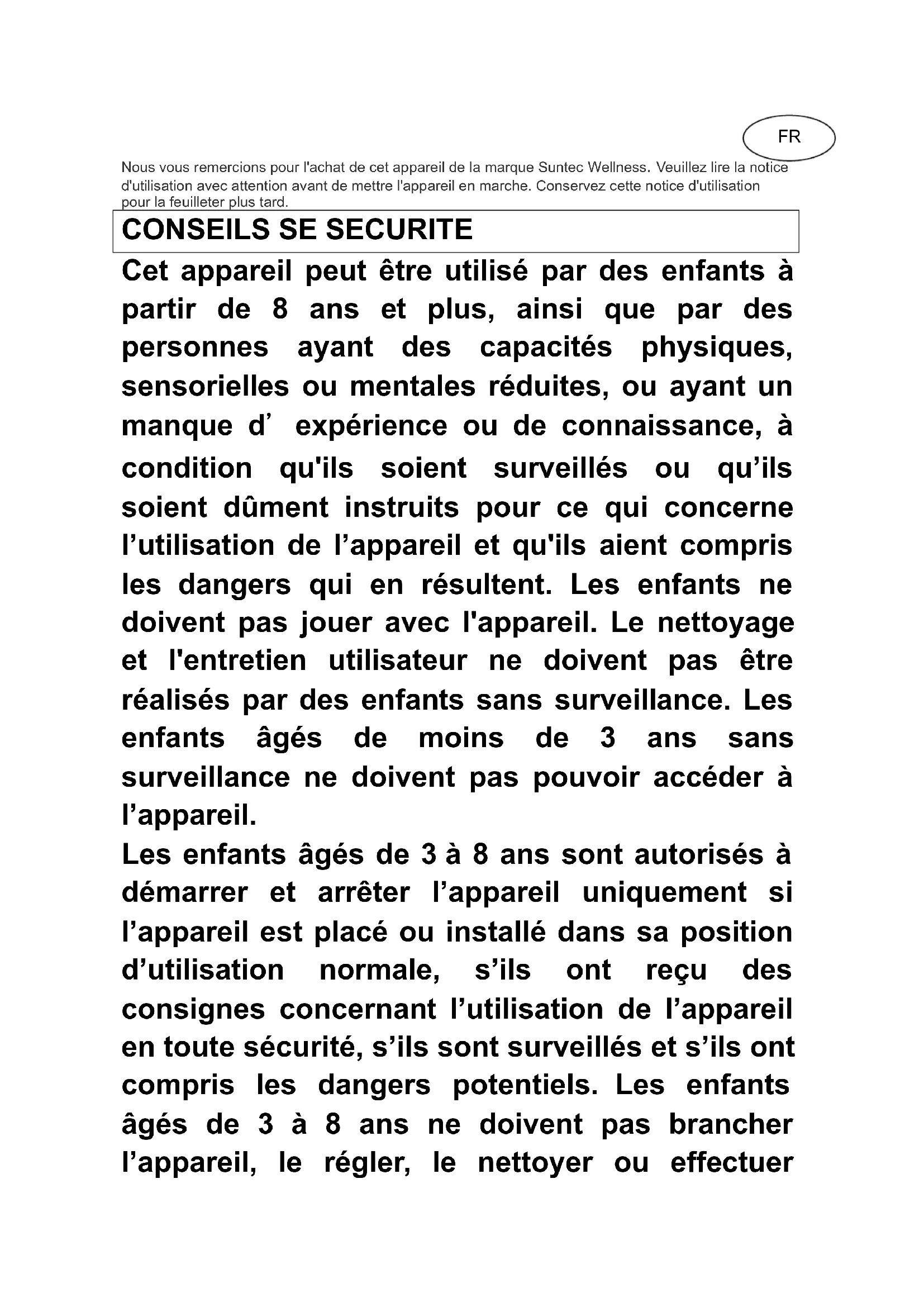 Cet appareil peut être utilisé par des enfants à partir de 8 ans et plus, ainsi que par des personnes ayant des capacités physiques, sensorielles ou mentales réduites, ou ayant un manque d ’expérience ou de connaissance, à condition qu'ils soient surveillés ou qu’ils soient dûment instruits pour ce qui concerne l’utilisation de l’appareil et qu'ils aient compris les dangers qui en résultent. Les enfants ne doivent pas jouer avec l'appareil. Le nettoyage et l'entretien utilisateur ne doivent pas être réalisés par des enfants sans surveillance. Les enfants âgés de moins de 3 ans sans surveillance ne doivent pas pouvoir accéder à l’appareil. Les enfants âgés de 3 à 8 ans sont autorisés à démarrer et arrêter l’appareil uniquement si l’appareil est placé ou installé dans sa position d’utilisation normale, s’ils ont reçu des consignes concernant l’utilisation de l’appareil en toute sécurité, s’ils sont surveillés et s’ils ont compris les dangers potentiels. Les enfants âgés de 3 à 8 ans ne doivent pas brancher l’appareil, le régler, le nettoyer ou effectuer FRl’entretien.